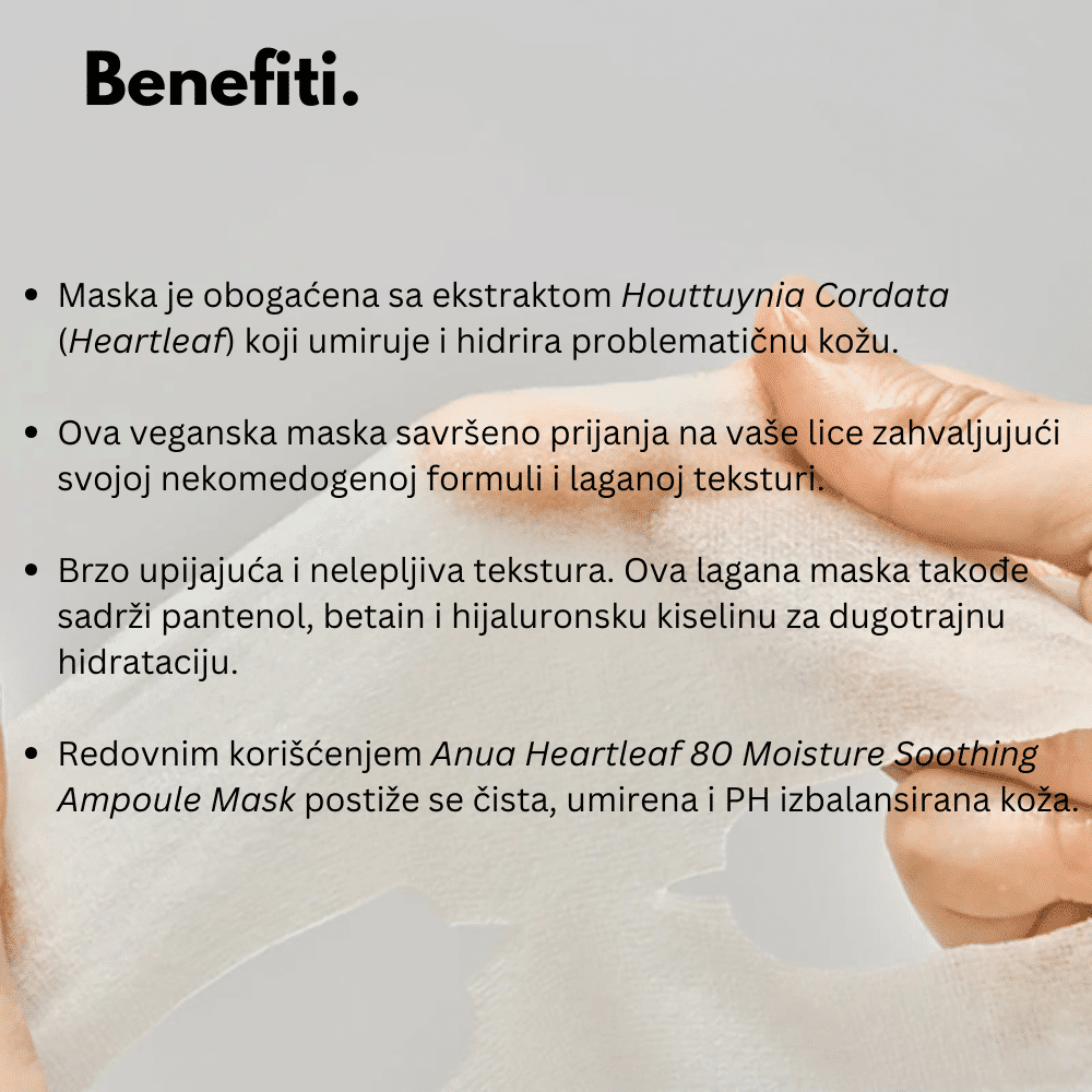 ANUA Heartleaf 80 Moisture Soothing Ampoule Mask 27ml je ampulna maska koja sadrži 80% ekstrakta lista biljke Heartleaf-a, poznatog po svojim umirujućim i hidratantnim svojstvima. Ova maska je posebno dizajnirana za osetljivu kožu, jer pomaže u smanjenju crvenila i iritacija, dok istovremeno pruža intenzivnu hidrataciju i osveženje.