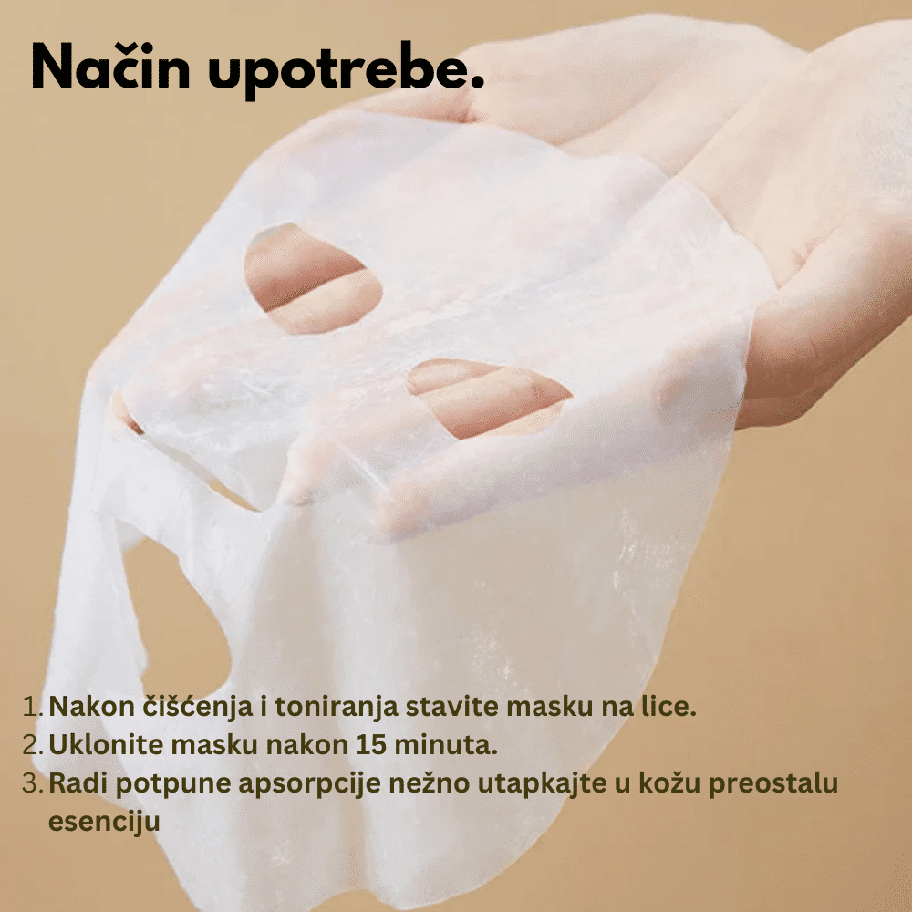 Nakon čišćenja i toniranja lica, pažljivo nanesite masku na celo lice, izbegavajući područje oko očiju. Ostavite masku da deluje 15-20 minuta, a zatim je uklonite. Nema potrebe za ispiranjem, ostatak seruma možete nežno utapkati u kožu.