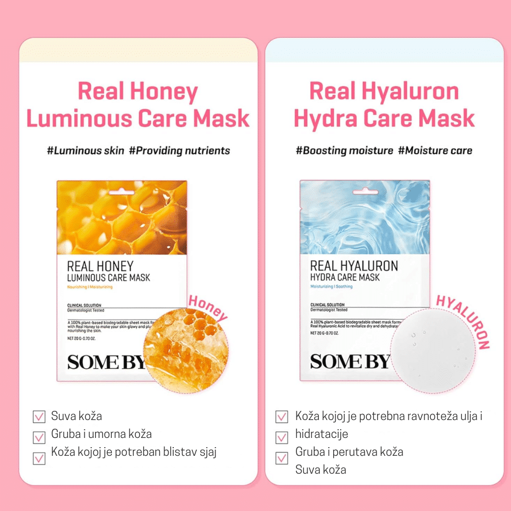 SOMEBYMI Real Honey Luminous Care Mask je hranljiva sheet maska obogaćena ekstraktom meda i propolisa koji intenzivno hidrira i hrani kožu, pružajući joj blistav i zdrav izgled. Med i propolis poznati su po svojim antibakterijskim i regenerativnim svojstvima, dok dodatni sastojci poput hijaluronske kiseline i pantenola jačaju kožnu barijeru i pružaju dubinsku hidrataciju. Ova maska umiruje iritacije, revitalizuje umornu kožu i ostavlja je glatkom i osveženom. Savršeno prilagođena svim tipovima kože, uključujući suvu i osetljivu.