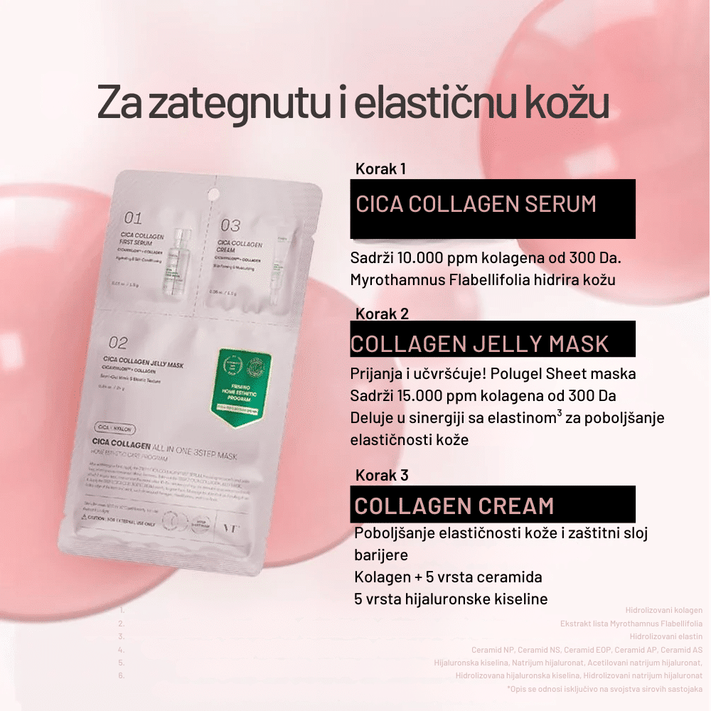 VT CICA Collagen All In One 3-Step Mask je sveobuhvatni tretman za intenzivnu regeneraciju, hidrataciju i revitalizaciju kože. Ova maska sadrži tri koraka koji zajednički deluju na poboljšanje teksture kože, jačanje elastičnosti i umirivanje iritacija. Prvi korak uključuje CICA gel, koji priprema kožu i umiruje crvenilo. Drugi korak je kolagen maska obogaćena visokokoncentrisanim hidrolizovanim kolagenom za poboljšanje čvrstine i smanjenje bora. Treći korak završava tretman sa hidratantnom kremom, koja zaključava vlagu i pruža dugotrajan osećaj mekoće.