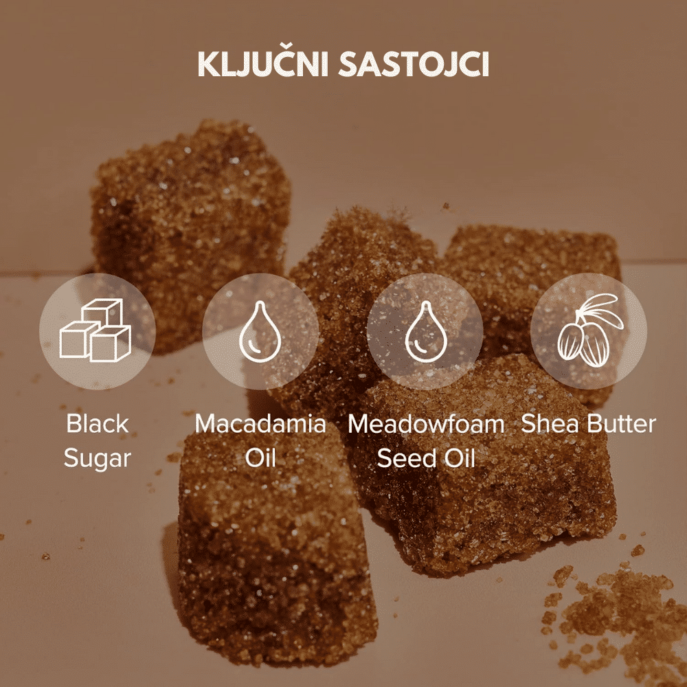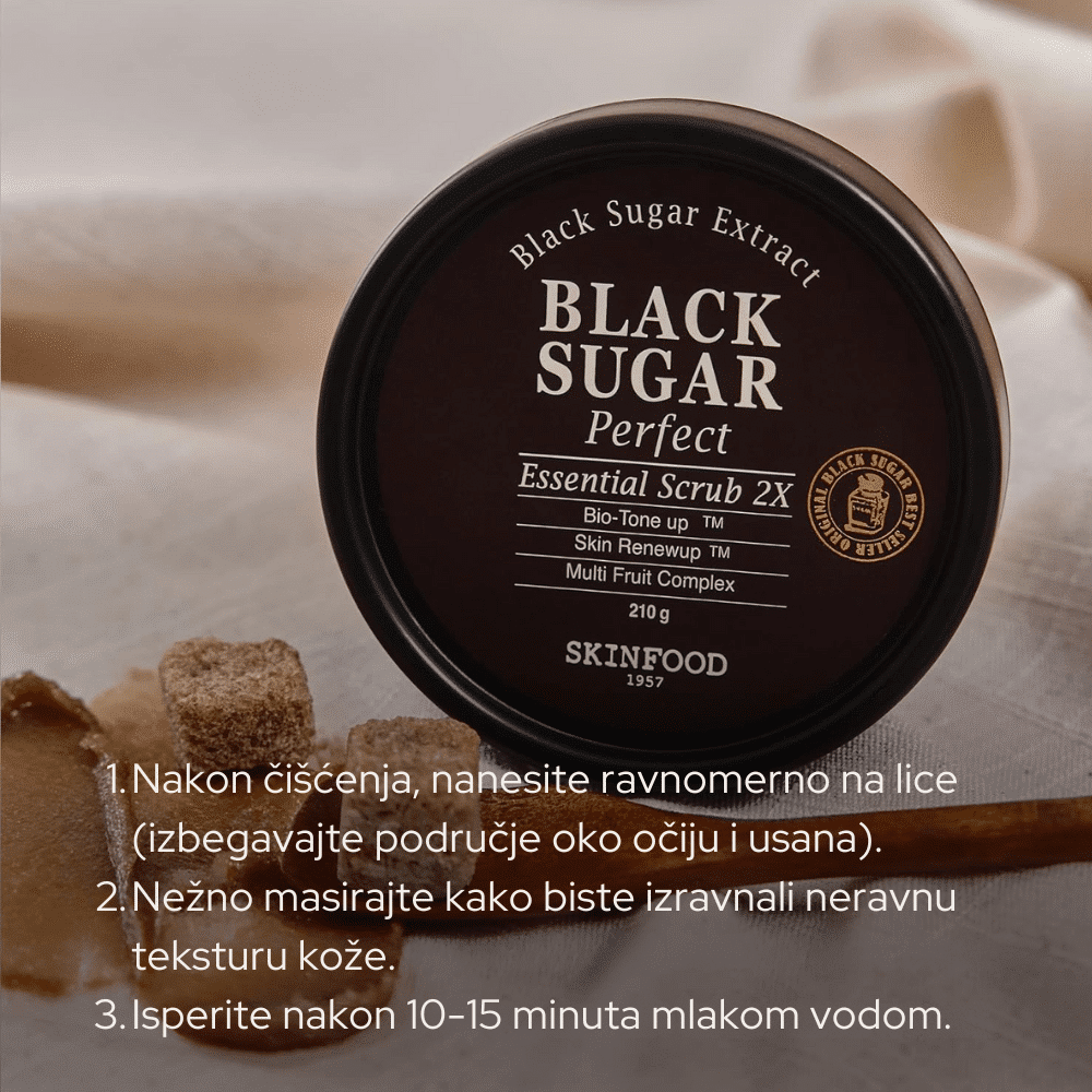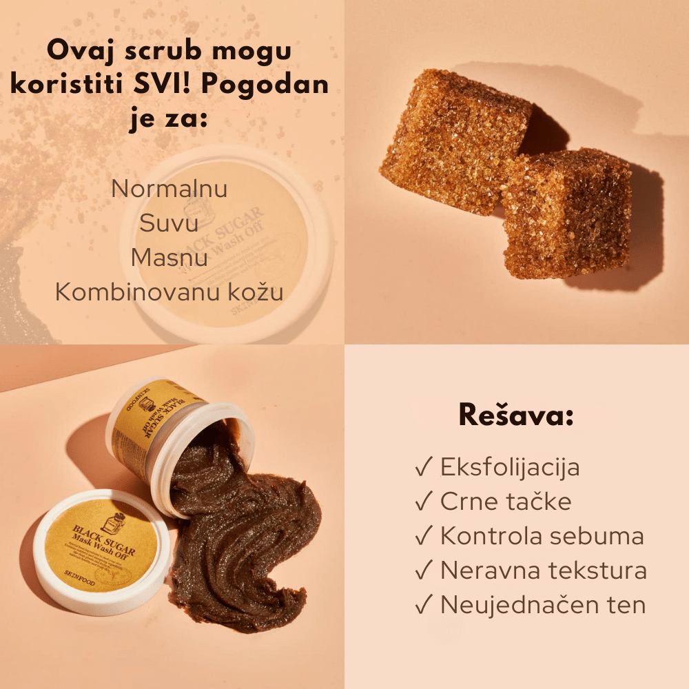 SKINFOOD Black Sugar Mask Wash Off eksfolijant čisti pore, omekšava i hrani kožu uz crni šećer, shea puter i makadamijino ulje.