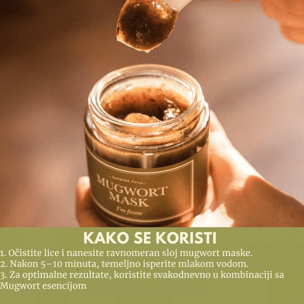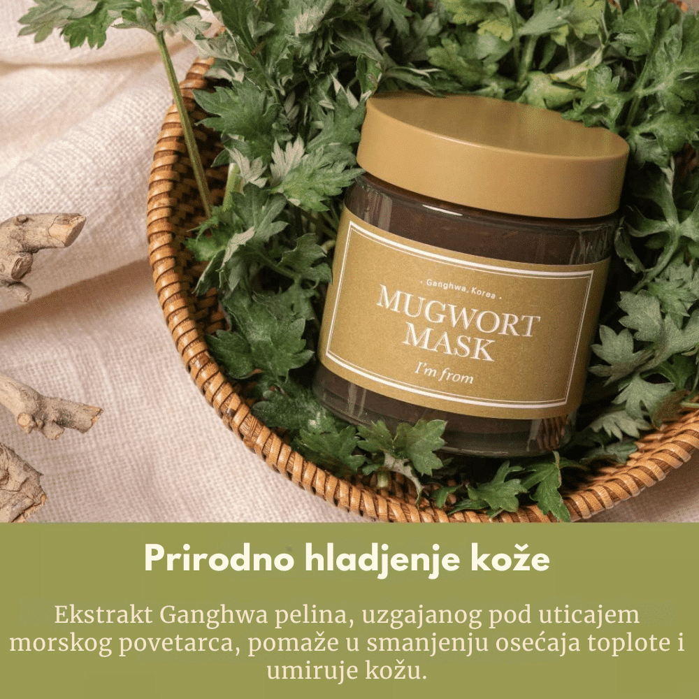 I’m From Mugwort Mask 30g je umirujuća maska za lice koja koristi 2,1% praha listova Artemisije (Mugwort) iz okruga Ganghwa u Koreji, sastojka poznatog po svojim antiinflamatornim i detoks svojstvima. Ova gelasta maska pruža trenutni efekat hlađenja, smanjujući crvenilo i iritacije, dok istovremeno hidrira i osvežava kožu. Obogaćena biljnim ekstraktima poput zelenog čaja, kamilice i Centelle Asiatice, maska pomaže u revitalizaciji i zaštiti kože od štetnih uticaja okoline. Njena blaga formula čini je pogodnom za svakodnevnu upotrebu, posebno za osobe sa osetljivom ili iritiranom kožom.