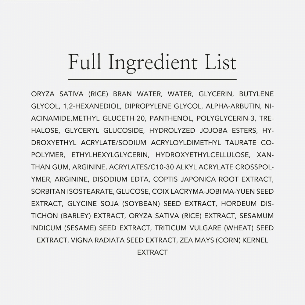 Oryza Sativa (Rice) Bran Water(68.6 %), Water, Glycerin,Butylene Glycol, 1,2-hexanediol, Dipropylene Glycol, Alpha-arbutin(2 %), Niacinamide, Methyl Gluceth-20, Panthenol, Polyglycerin-3, Trehalose, Glyceryl Glucoside, Hydrolyzed Jojoba Esters, Hydroxyethyl Acrylate/SodiumAcryloyldimethyl Taurate Copolymer, Ethylhexylglycerin, Hydroxyethylcellulose, Xanthan Gum, Acrylates/C10-30 Alkyl Acrylate Crosspolymer, Arginine, Disodium EDTA, Coptis Japonica Root Extract, Sorbitan Isostearate, Glucose, Coix Lacryma-jobi Ma-yuen Seed Extract, Glycine Soja (Soybean) Seed Extract, Hordeum Distichon (Barley) Extract, Oryza Sativa (Rice) Extract, Sesamum Indicum (Sesame) Seed Extract, Triticum Vulgare (Wheat) Seed Extract, Vigna Radiata Seed Extract, Zea Mays (Corn) Kernel Extract