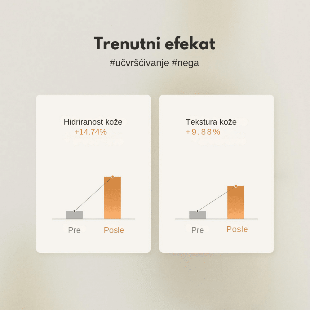 Klinička ispitivanja su pokazala sledeće rezultate: Nakon 2 nedelje korišćenja, zabeleženo je poboljšanje u vertikalnim borama od 5,11%, dok je nakon 4 nedelje poboljšanje iznosilo 6,18%. Nakon 2 nedelje upotrebe, elastičnost kože je poboljšana za 0,87%, a nakon 4 nedelje za 2,36%. Odmah nakon upotrebe, nivo hidratacije kože je povećan za 14,74%. dmah nakon upotrebe, zabeleženo je poboljšanje od 8,17% u jačanju kožne barijere. Proizvod je formulisan bez parabena, sulfata i alkohola, kao ni dodate mirise.