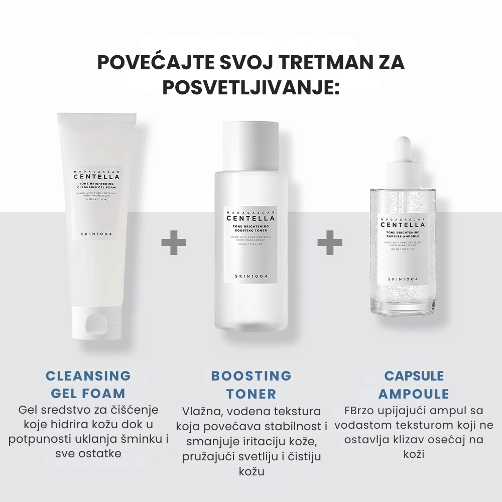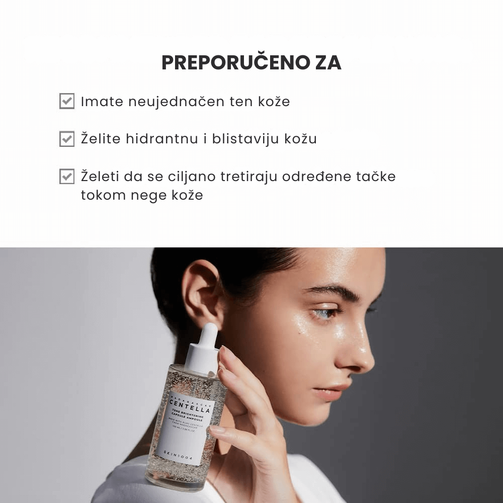 Skin1004 Madagascar Centella Tone Brightening Capsule Ampoule je visokoefikasan serum formulisan za posvetljivanje tena i ujednačavanje boje kože. Obogaćen sa 77% Centella Asiatica ekstrakta i moćnom kombinacijom 4% niacinamida i 2% traneksamične kiseline, ovaj serum deluje direktno na hiperpigmentacije i tamne fleke, vidno poboljšavajući izgled kože kroz redovnu upotrebu. U formuli se nalaze i mikro kapsule Madewhite™ koje oslobađaju madecassoside, poznat po svojim regenerativnim i umirujućim svojstvima. Lagana, vodenasta tekstura brzo se upija i ostavlja kožu glatkom, hidriranom i vidno osvetljenom. Proizvod je idealan za sve tipove kože, uključujući osetljivu, i može se koristiti svakodnevno u jutarnjoj i večernjoj rutini.