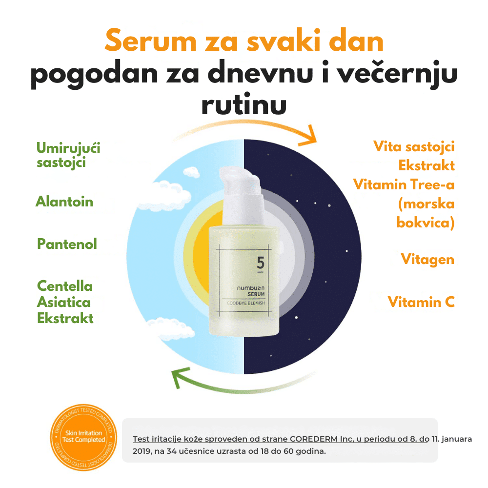 Numbuzin No.5 Goodbye Blemish Serum je specijalno formulisan serum namenjen za posvetljivanje i ujednačavanje tena. Sadrži 75% ekstrakta vučjeg trna (Hippophae Rhamnoides), prirodni izvor vitamina, koji efikasno smanjuje hiperpigmentacije, ožiljke od akni i fleke.