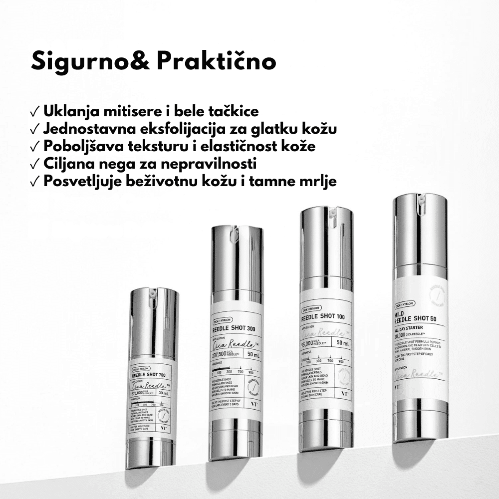 VT Reedle Shot 700 koristi mikrostrukture za ciljanje bora i regeneraciju kože, uz hidrolizovani kolagen, niacinamid i hijaluronsku kiselinu za vidljive rezultate.