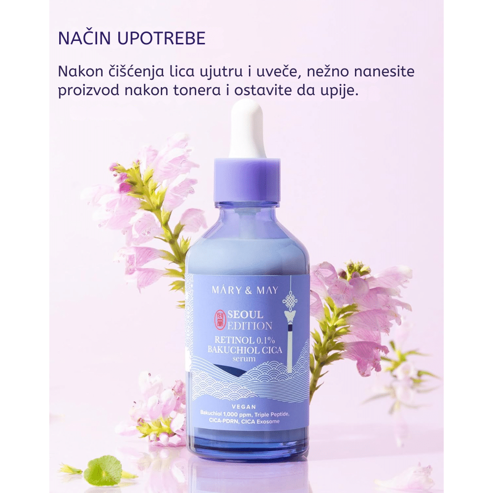 Mary&May Retinol 0.1% Bakuchiol CICA Serum smanjuje bore, regeneriše kožu i umiruje iritacije uz retinol, bakuchiol i CICA ekstrakt.