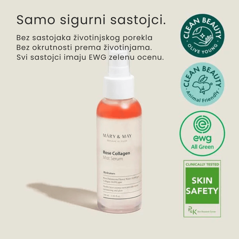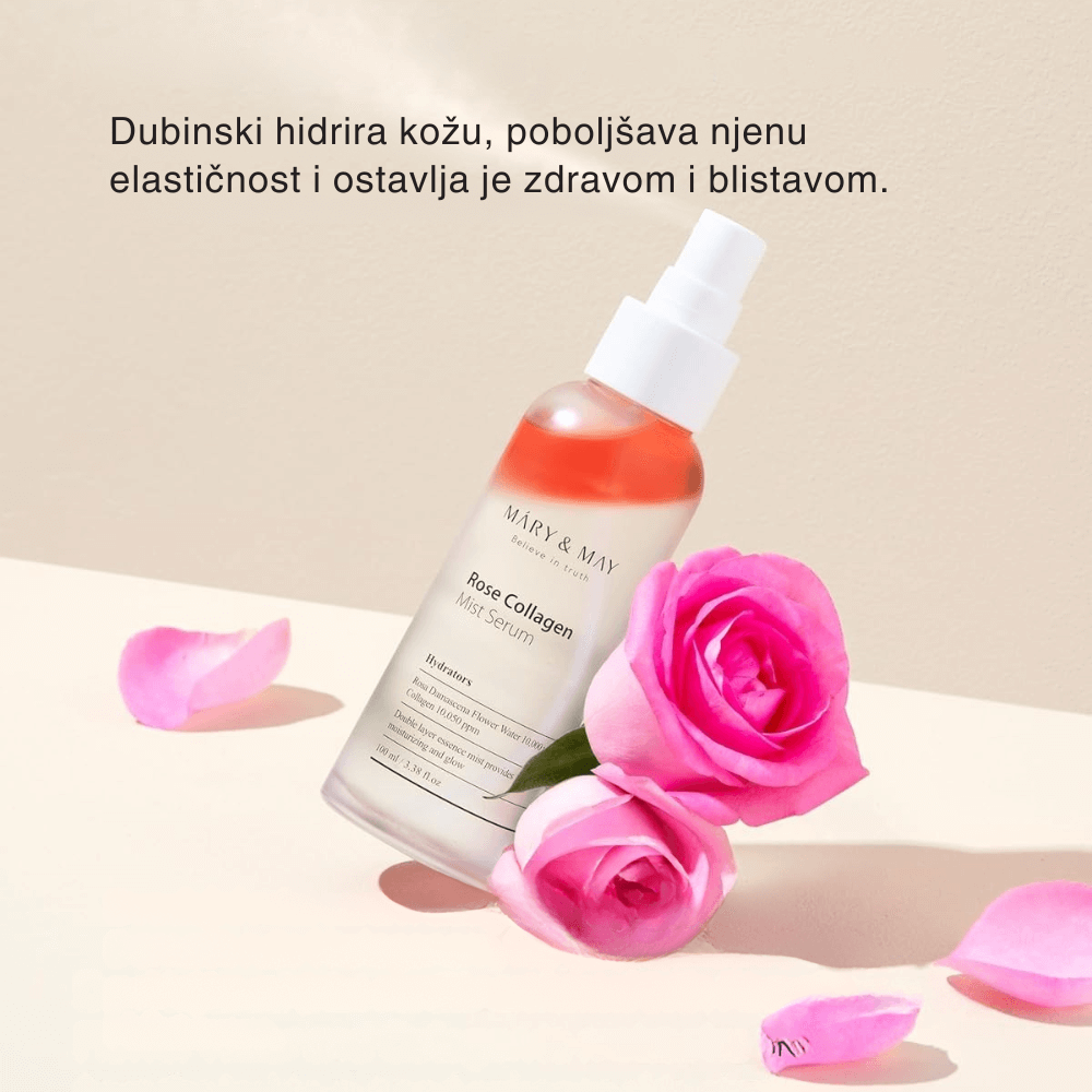 Mary&May Rose Collagen Mist Serum 100ml je dvostruko slojeviti serum u spreju koji kombinuje vodeni sloj sa 10.000 ppm hidrolizovanog kolagena i 10.000 ppm vode cveta damask ruže, zajedno sa uljanim slojem bogatim biljnim uljima poput maslinovog, jojobinog i avokadovog ulja. Ova jedinstvena formulacija pruža intenzivnu hidrataciju, poboljšava elastičnost kože i vraća joj prirodni sjaj.