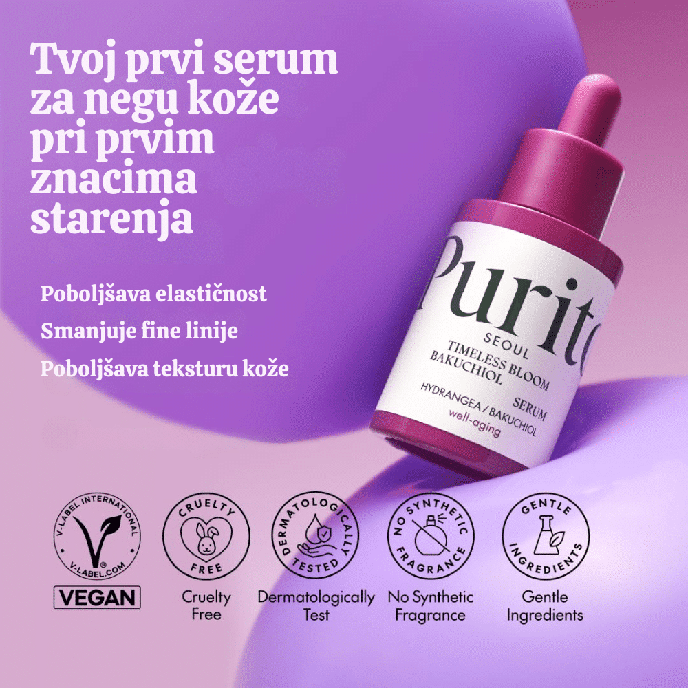 PURITO Timeless Bloom Bakuchiol Serum je serum formulisan za poboljšanje elastičnosti kože i smanjenje pojave finih linija i bora. Sadrži bakuchiol (10,000 ppm), prirodnu alternativu retinolu, koja pruža anti-age benefite bez iritacije. Obogaćen je ekstraktom lista hortenzije (Hydrangea Macrophylla) sa ostrva Jeju, koji doprinosi čvrstoći kože i smanjenju bora. Serum je pogodan za sve tipove kože, uključujući i osetljivu, zahvaljujući svojoj hipoalergenskoj formuli bez veštačkih mirisa i esencijalnih ulja. Idealan je za sve kojima je potrebno poboljšanje elastičnosti kože, smanjenje finih linija i bora, te pružanje dubinske ishrane bez iritacije.