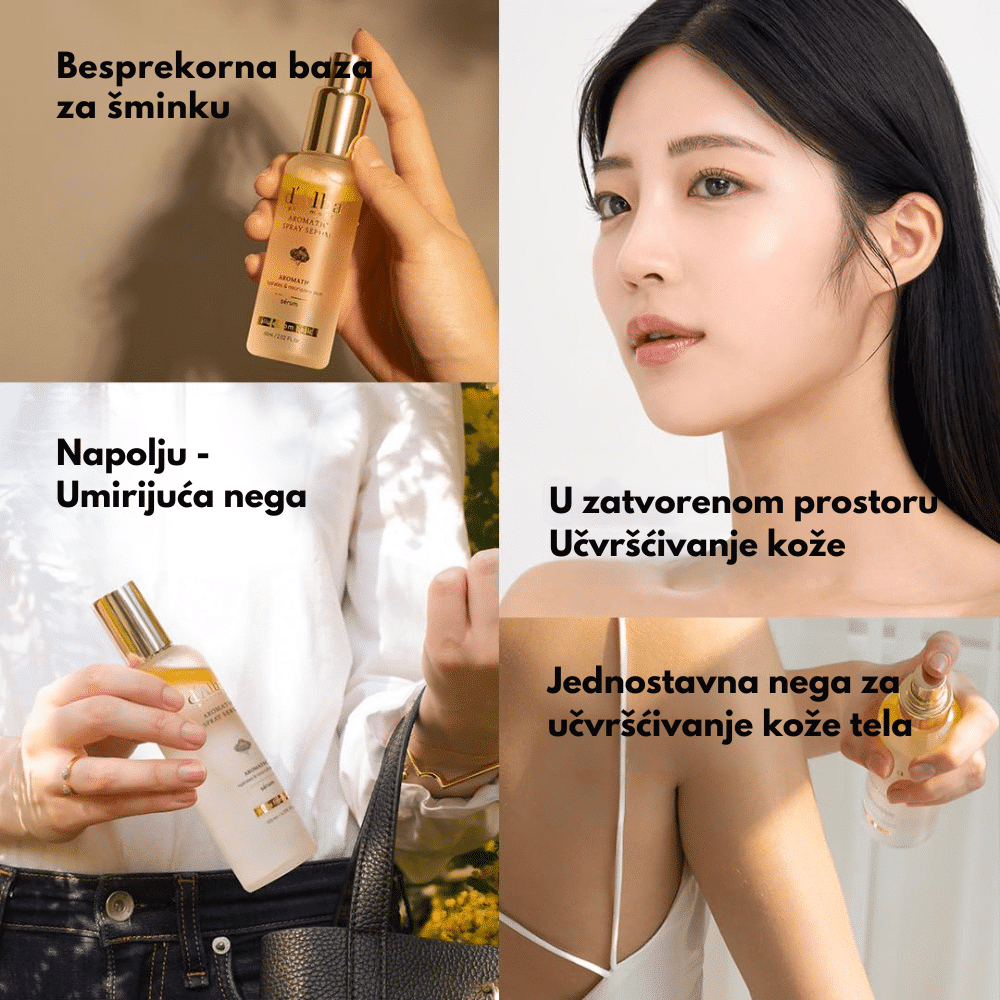 Pre upotrebe, dobro promućkajte bočicu kako biste sjedinili slojeve seruma i ulja. Držite bočicu na udaljenosti od oko 20 cm od lica i nežno poprskajte 2-3 puta, zatvarajući oči i usta. Nakon nanošenja, lagano tapkajte kožu vrhovima prstiju kako biste pospešili apsorpciju. Može se koristiti ujutru i uveče, kao i tokom dana za osveženje. Izbegavajte direktan kontakt sa očima; u slučaju iritacije, prekinite upotrebu i konsultujte se sa dermatologom.