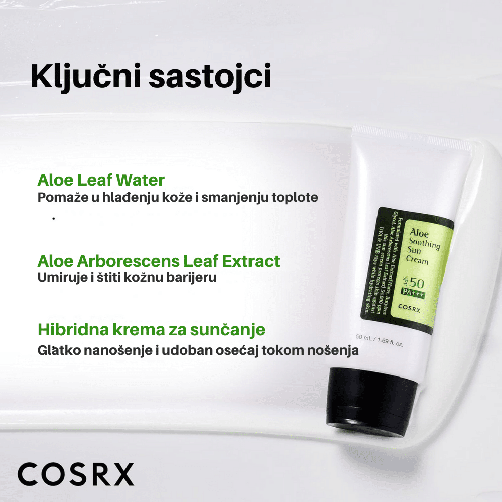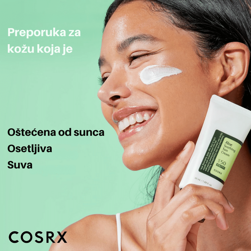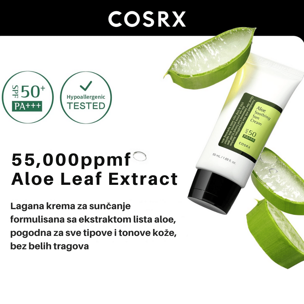 COSRX Aloe Soothing Sun Cream SPF50+ PA+++ 50ml je višenamenska krema za sunčanje koja pruža visoku zaštitu od štetnih UV zraka, dok istovremeno hidrira i umiruje kožu. Obogaćena ekstraktom lista Aloe Arborescens, poznatim po svojim umirujućim i hidratantnim svojstvima, ova krema je idealna za svakodnevnu upotrebu. Lagana tekstura omogućava brzo upijanje bez ostavljanja belih tragova ili masnog osećaja na koži. Pogodna je za sve tipove kože, uključujući osetljivu i sklonu iritacijama.