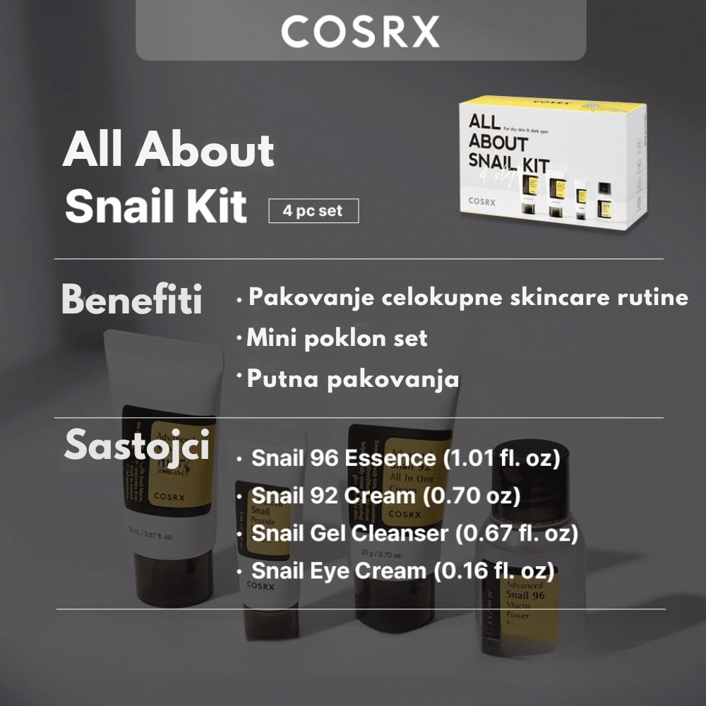 Cosrx je korejski kozmetički brend poznat po svojoj efikasnosti i jednostavnim, ali visokokvalitetnim proizvodima za negu kože. Osnovan 2013. godine, Cosrx je postao popularan zahvaljujući svojoj posvećenosti stvaranju proizvoda koji koriste minimalan broj sastojaka, ali sa maksimalnim učinkom, što ih čini idealnim za osetljivu kožu. Brend nudi širok spektar proizvoda, uključujući serume, tonere, maske i kreme, sa naglaskom na upotrebi sastojaka kao što su AHA, BHA, niacinamid, propolis i drugi biljni ekstrakti. Njihovi proizvodi su veganski, cruelty-free i ne sadrže parabene, sulfate ili veštačke mirise. Cosrx je prepoznat po svojoj jednostavnoj, ali efikasnoj formuli koja pomaže u rešavanju problema sa kožom kao što su akne, suvoća i nepravilnosti. Takođe, brend se ističe svojom posvećenostšću naučnoj i dermatološkoj istraživačkoj osnovi.