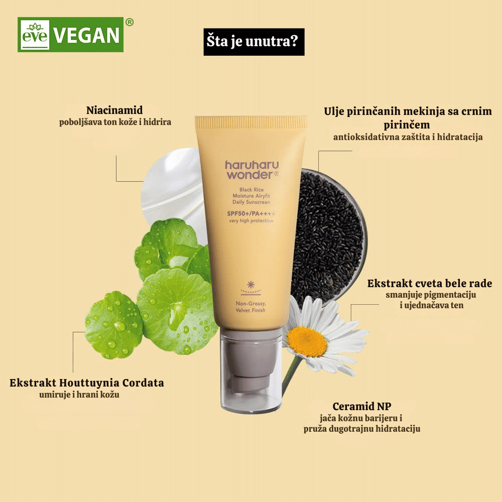Haruharu Wonder Black Rice Moisture Airyfit Daily Sunscreen je lagana, hidratantna hemijska krema za sunčanje sa SPF50+ PA++++, koja pruža snažnu zaštitu od UVA i UVB zraka, dok istovremeno neguje i hidrira kožu. Formulisana sa fermentisanim crnim pirinčem, niacinamidom i biljnim ekstraktima, ova krema štiti kožu od štetnih spoljašnjih faktora, poboljšava njen tonus i elastičnost, te umiruje crvenilo i iritacije. Crni pirinač je bogat polifenolima i flavonoidima, snažnim antioksidansima koji pomažu u neutralizaciji slobodnih radikala i sprečavanju preuranjenog starenja kože. Fermentacija dodatno poboljšava apsorpciju aktivnih sastojaka, omogućavajući koži da maksimalno iskoristi njegove hranljive benefite. Ova nekomedogena formula ne ostavlja beli trag niti osećaj težine na koži, a njena svilenkasto-lagana tekstura omogućava brzo upijanje i savršenu pripremu kože za šminku.