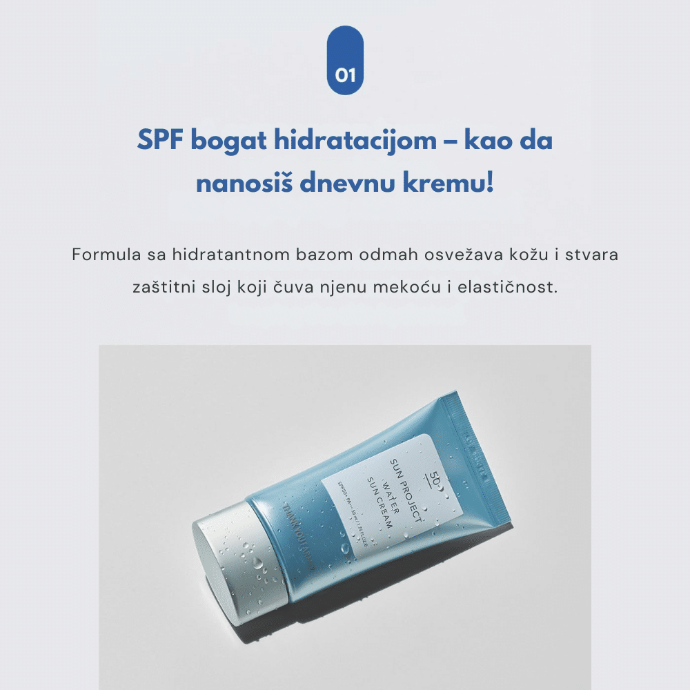 THANK YOU FARMER Sun Project Water Sun Cream SPF50+ PA+++ 50ml je hibridna dnevna krema sa zaštitnim faktorom koja kombinuje visoku UV zaštitu sa hidratantnim i umirujućim sastojcima, idealna za normalnu do suvu kožu. Njena lagana, nemasna tekstura se brzo upija, ostavljajući kožu blistavom bez belog traga. Formulisana je sa kombinacijom hemijskih i fizičkih UV filtera, uključujući Ethylhexyl Methoxycinnamate, Homosalate, Octocrylene i Titanium Dioxide, koji zajedno pružaju širokospektralnu zaštitu od UVA i UVB zraka. Dodatni sastojci poput ekstrakta aloe vere, Centella Asiatica, bambusove vode i hijaluronske kiseline umiruju i hidriraju kožu, dok ulja suncokreta i sacha inchi semena jačaju kožnu barijeru i pružaju antioksidativnu zaštitu. Ova krema je pogodna za svakodnevnu upotrebu, pružajući koži potrebnu zaštitu i negu tokom celog dana.