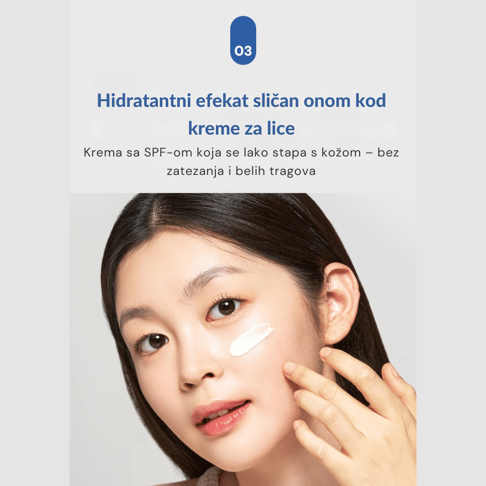 Hidratantna dnevna krema sa SPF50+ pruža visoku UV zaštitu, umiruje i hidrira kožu, ostavljajući je blistavom bez belog traga.