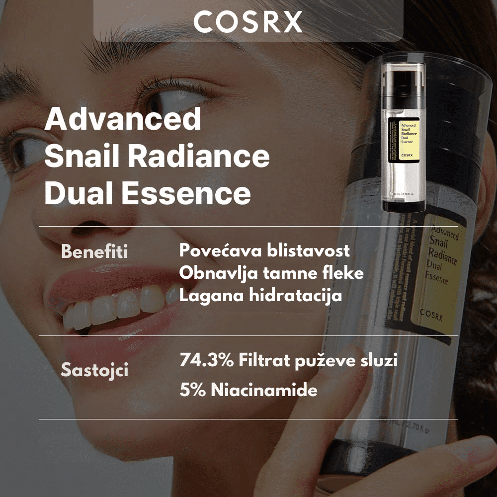 Esencija sa 74,3% puževe sluzi i 5% niacinamida pruža hidrataciju, posvetljuje ten i poboljšava elastičnost kože, za blistav i zdrav izgled.