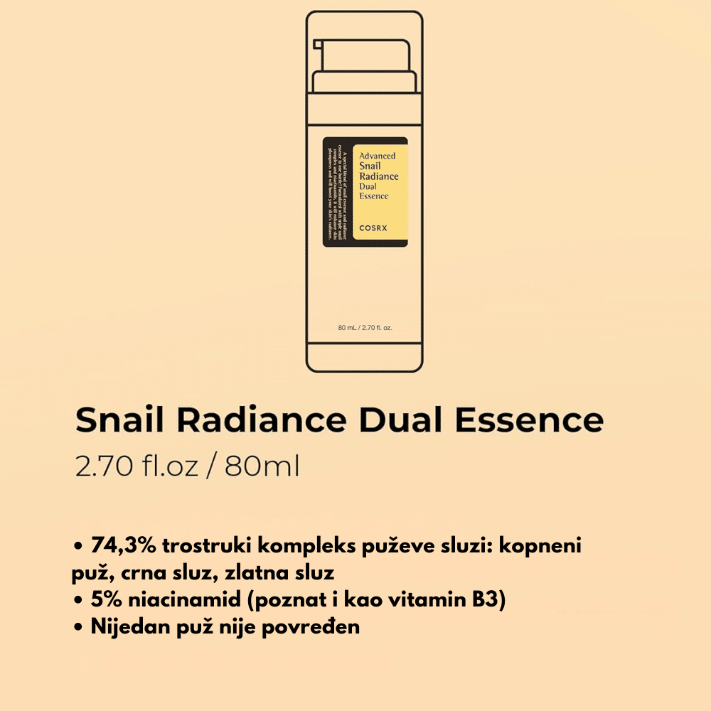COSRX Advanced Snail Radiance Dual Essence 80ml je inovativna esencija koja kombinuje regenerativna svojstva puževe sluzi i posvetljujuće efekte niacinamida za postizanje zdrave, blistave kože. Sa čak 74,3% filtrata puževe sluzi, ovaj proizvod intenzivno hidrira kožu, poboljšava njenu elastičnost i ubrzava regeneraciju, dok 5% niacinamida efikasno posvetljuje tamne fleke, ujednačava ten i smanjuje crvenilo. Esencija je bogata dodatnim hranljivim uljima, poput ulja semenki suncokreta i arganovog ulja, koji pružaju dodatnu negu i jačaju barijeru kože. Formulacija je lagana, ali bogata hranljivim sastojcima, čineći je idealnom za sve tipove kože, uključujući osetljivu i problematičnu kožu sklonu aknama. Dvostruki efekat hidratacije i posvetljivanja omogućava koži da izgleda osveženo, ujednačeno i revitalizovano tokom celog dana. Ova esencija je savršena za one koji žele kombinaciju anti-age i hidratantne nege, bez iritacija.
