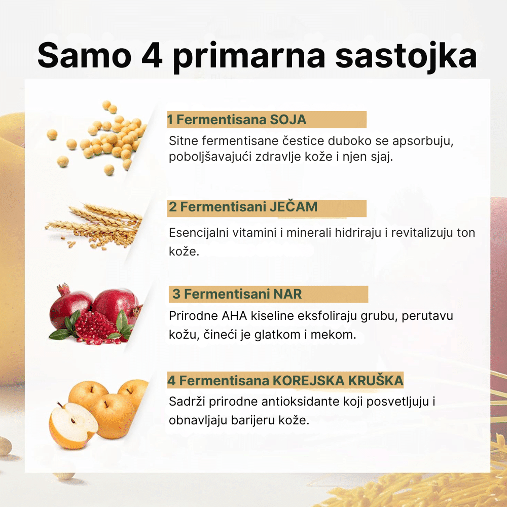 Water, Propanediol, Glycerin, Lactobacillus/Soybean Ferment Extract, Lactobacillus/Punica Granatum (Pomegranate) Fruit Ferment Extract, Saccharomyces/Barley Seed Ferment Filtrate, Lactobacillus/Pear Juice Ferment Filtrate