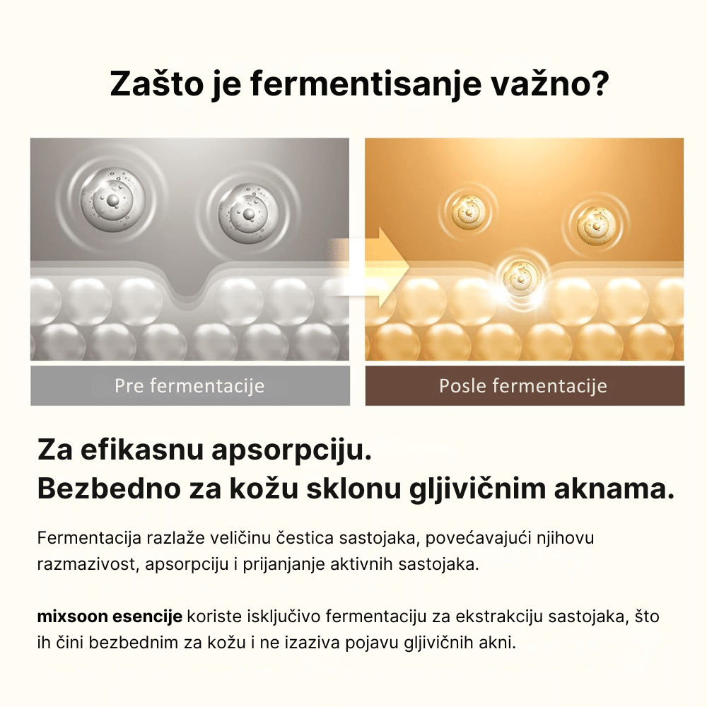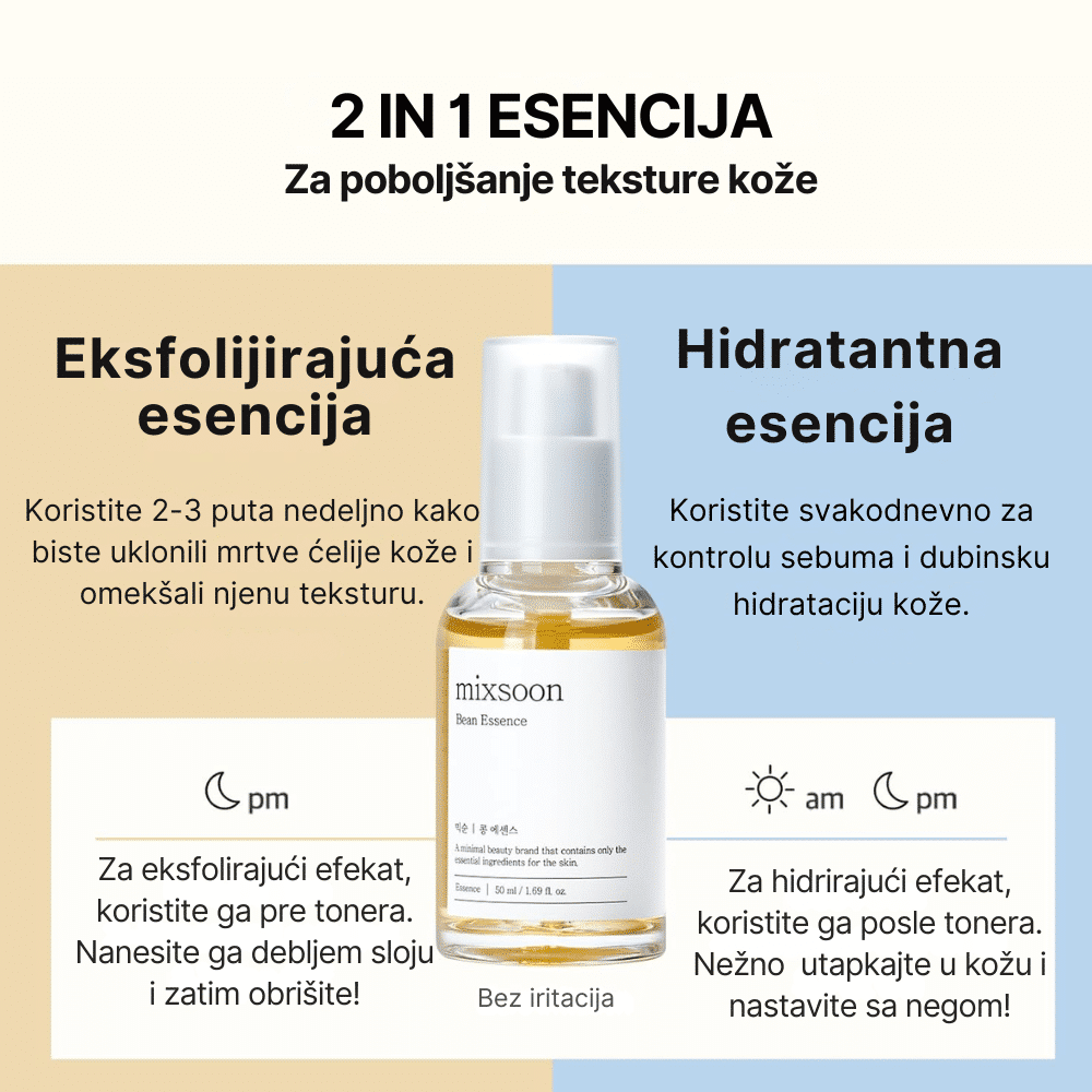Mixsoon Bean Essence 30ml je multifunkcionalna esencija obogaćena prirodnim ekstraktima soje, ekstraktima soje, nara, ječma i korejske kruške, koji zajedno pružaju prirodne antioksidante bogate vitaminima C i E, jačaju zdravlje kože, revitalizuju ten i poboljšavaju teksturu kože. Ova esencija pomaže u uklanjanju mrtvih ćelija kože dok pruža dubinsku hidrataciju, ostavljajući kožu glatkom i osveženom. Bogata vitaminima C i E, esencija štiti kožu od štetnih uticaja okoline. Njena lagana formula se brzo upija, ostavljajući kožu glatkom, svežom i osveženom.