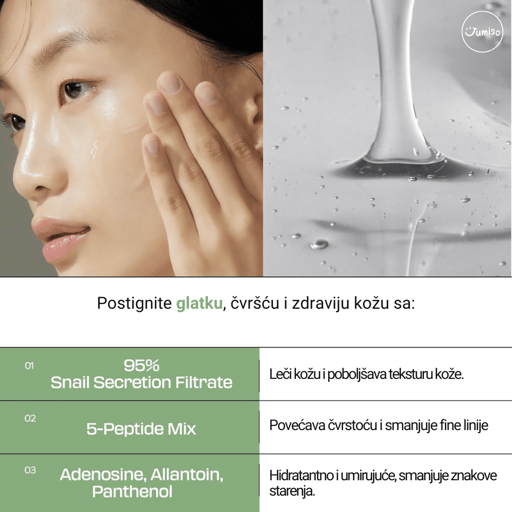 Filtrat puževe sluzi je bogat mukopolisaharidima, hijaluronskom kiselinom, glikolnom kiselinom, kolagenom i peptidima, što ga čini jednim od najmoćnijih sastojaka za hidrataciju, regeneraciju i umirivanje kože. Pomaže u ubrzavanju zaceljivanja, smanjenju ožiljaka, poboljšanju elastičnosti i ujednačavanju tena, dok istovremeno pruža anti-age efekte i štiti kožu od oksidativnog stresa. Zahvaljujući svojim antiinflamatornim i antibakterijskim svojstvima, odličan je za kožu sklonu aknama, iritacijama i crvenilu. Često se koristi u serumima, kremama i esencijama, a zbog svoje lagane teksture odgovara svim tipovima kože.