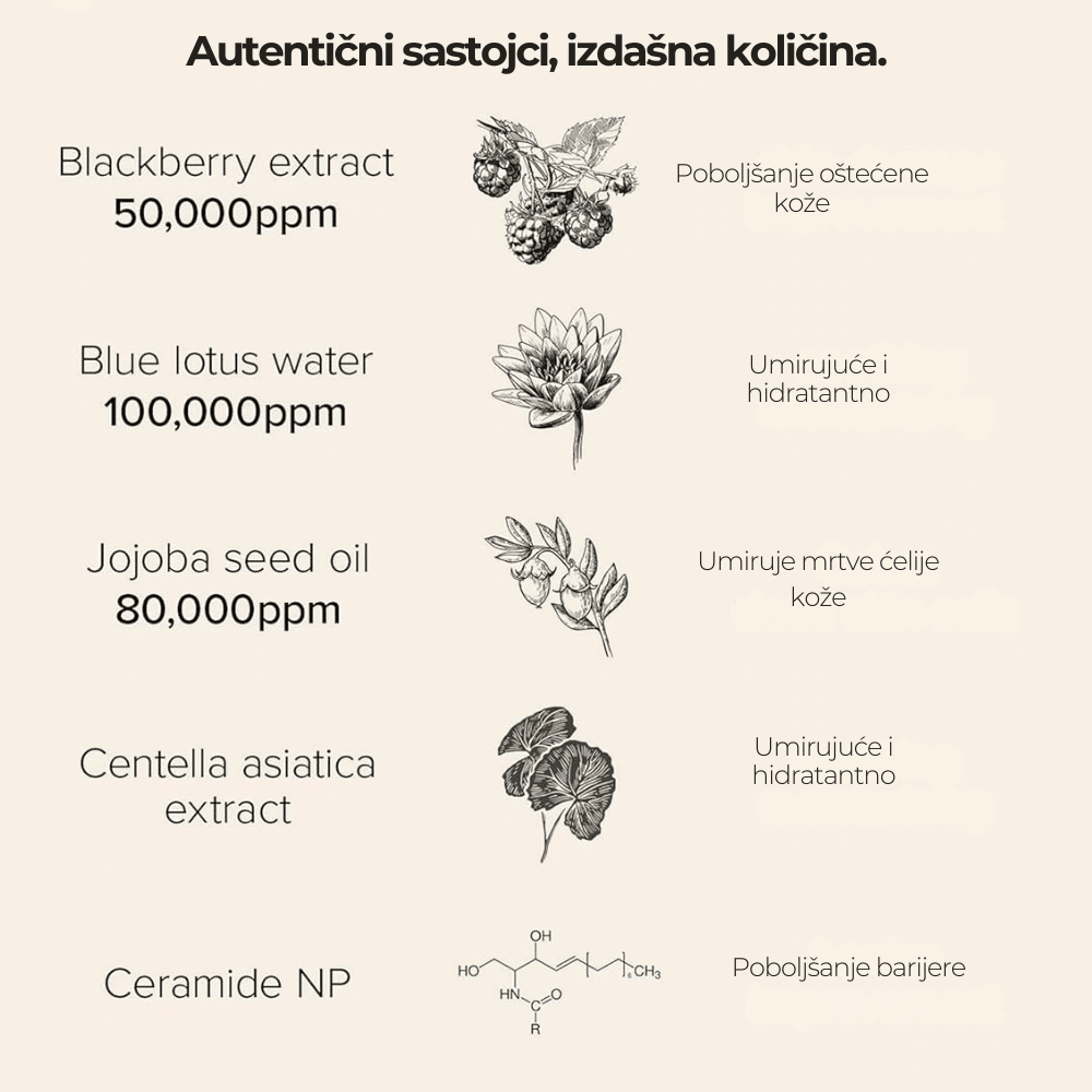 Water, Nymphaea Caerulea Flower Water, Simmondsia Chinensis (Jojoba) Seed Oil, Hydrogenated Poly(C6-14 Olefin), Rubus Fruticosus (Blackberry) Fruit Extract, 1,2-hexanediol, Methlypropanediol, Centella Asiatica Extract, Ficus Carica (Fig) Fruit Extract, Hydrolyzed Gardenia Florida Extract, Sodium Hyaluronate, Hydrogenated Lecithin, Butylene Glycol, Glycerin, Trilaureth-4 Phoshate, Sodium Polyacrylate, Pvm/Ma Copolymer, Cyanocobalamin, Ceramide Np, Maltodextrin, Ethylhexylglycerin, Tocopherol