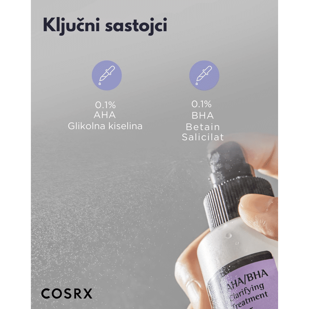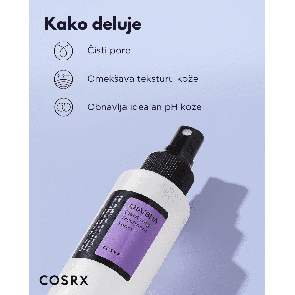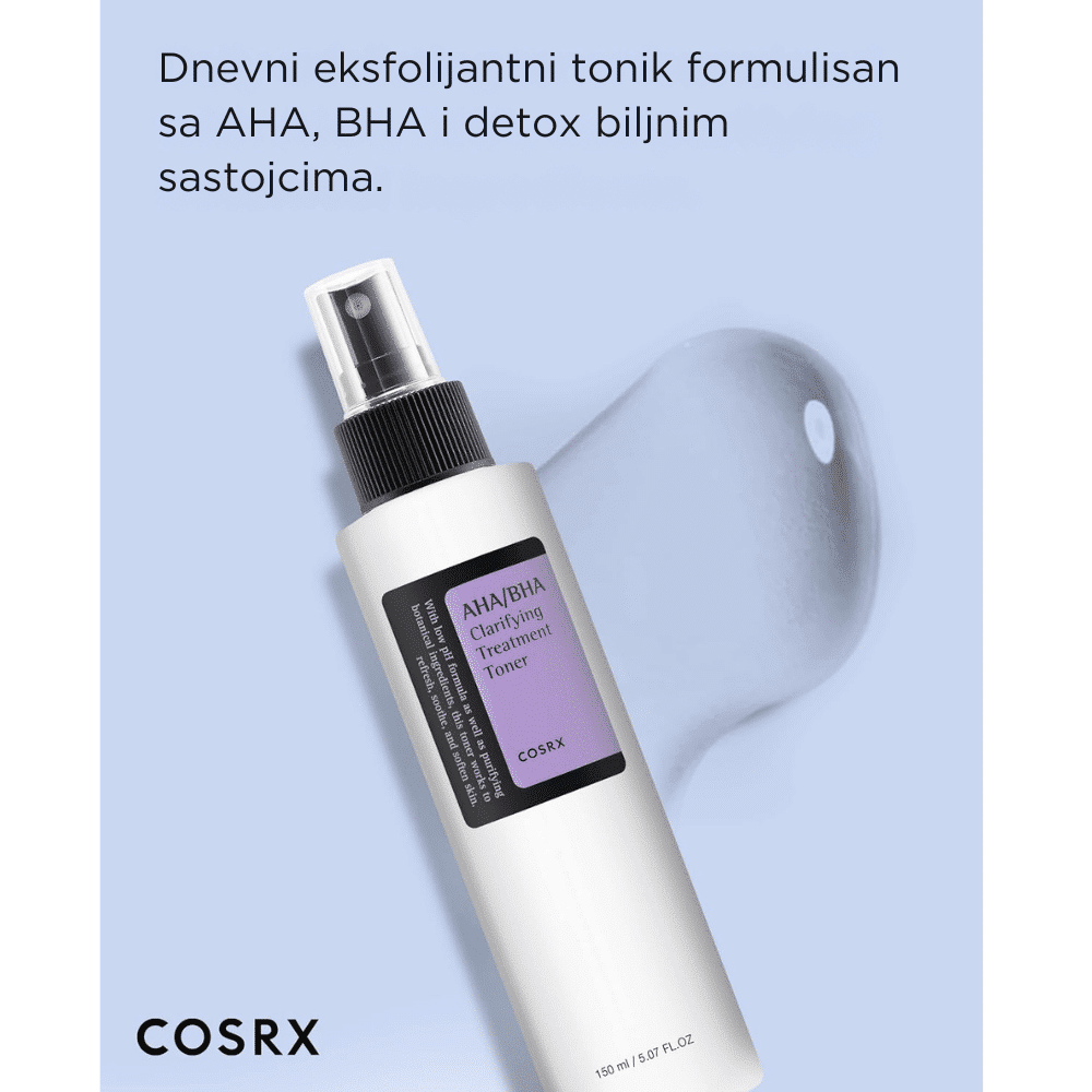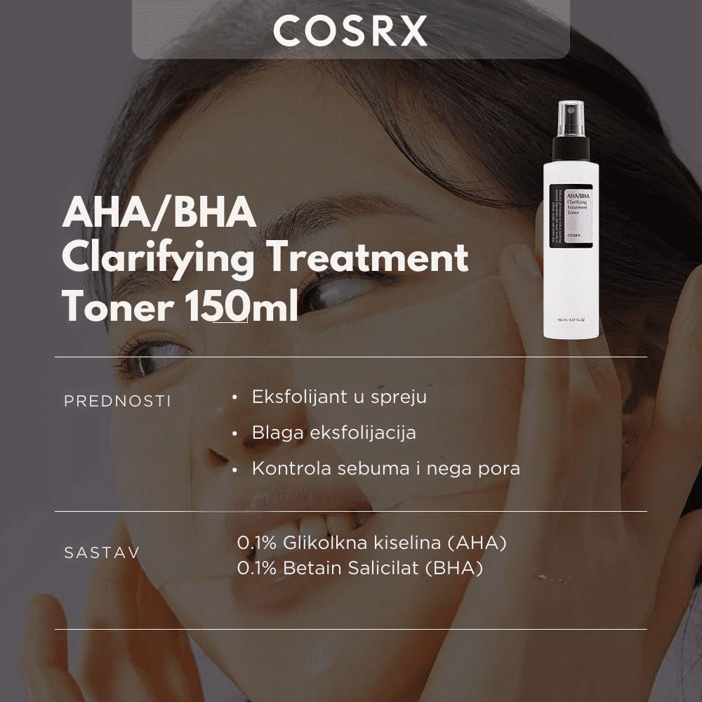 COSRX AHA/BHA Clarifying Treatment Toner 150ml je tonik koji kombinuje AHA (alpha-hydroxy acid) i BHA (beta-hydroxy acid), dva moćna sastojka koja efikasno čiste kožu, uklanjaju mrtve ćelije, smanjuju začepljenje pora i poboljšavaju teksturu kože. AHA deluje na površinske slojeve kože, poboljšava tonus i sjaj, dok BHA prodire dublje u pore, čisti ih od viška sebuma i nečistoća, smanjujući pojavu akni i blackhead-a. Ovaj toner je savršen za kožu sklona aknama, masnoj koži i poremećajima u teksturi, jer dubinski čisti pore, smanjuje crvenilo i osvežava kožu. Redovnom upotrebom, koža postaje glađa, zdravija i ujednačenijeg tona. Nežno exfolira, uklanja mrtve ćelije i pomaže koži da se regeneriše, čineći je mekom i osveženom.