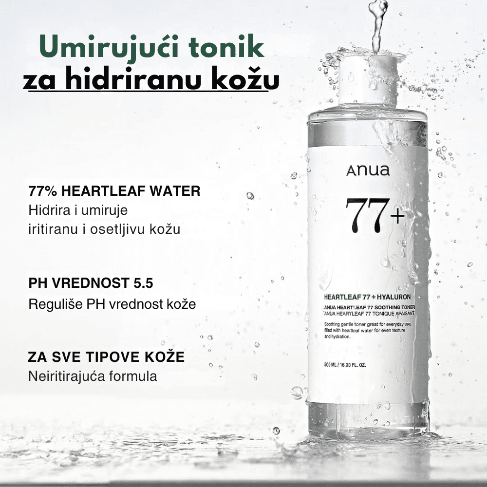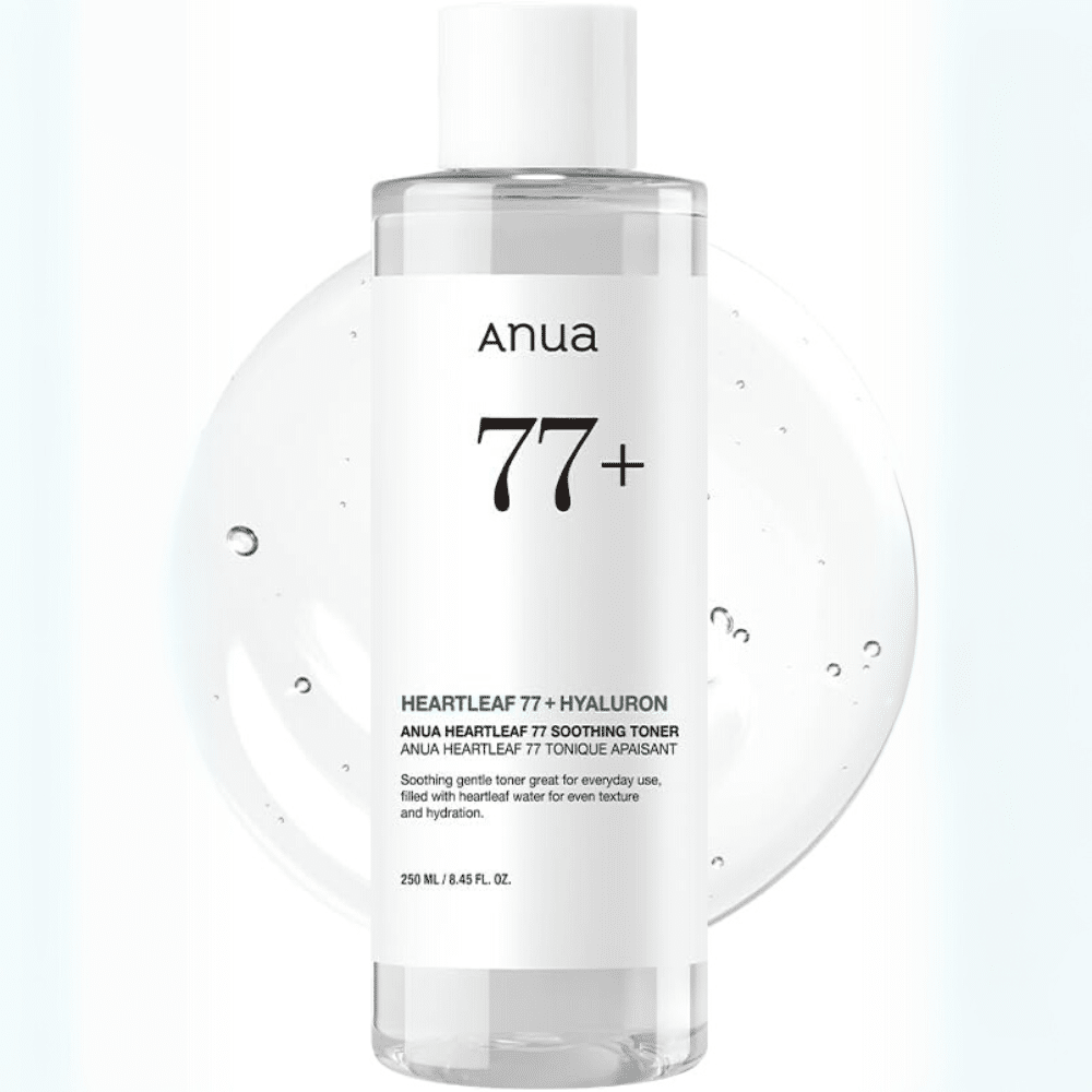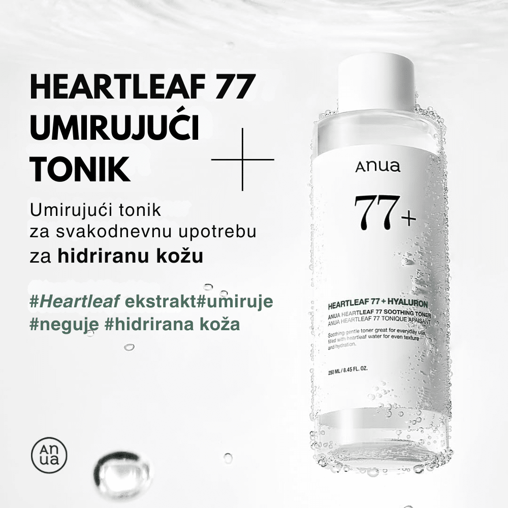 ANUA Heartleaf 77% Soothing Toner 250ml je tonik sa 77% ekstrakta lista biljke Heartleaf, poznate po svojim umirujućim i hidratantnim svojstvima. Ovaj tonik pomaže u smanjenju crvenila, iritacija i upala, dok istovremeno obnavlja i hidrira kožu.