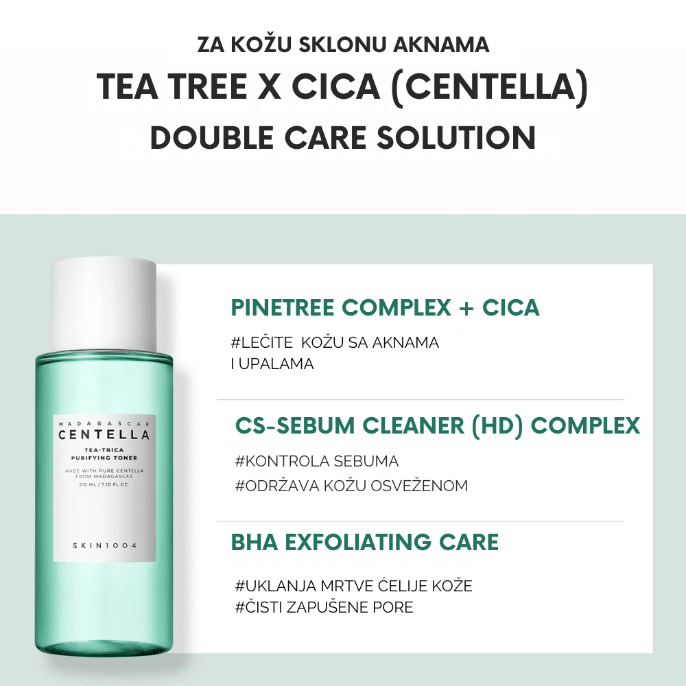 SKIN1004 Madagascar Centella Tea-Trica Purifying Toner je osvežavajući tonik posebno formulisan za masnu i kožu sklonu aknama. Sa 12% vode lista čajevca i 9,8% ekstrakta Centella Asiatica, ovaj tonik efikasno uklanja mrtve ćelije kože, višak sebuma i nečistoće, dok istovremeno pruža umirujuću negu i balansira proizvodnju ulja. Aktivni sastojci poput salicilne kiseline dubinski čiste pore, smanjujući pojavu mitesera i akni, dok lavanda i ulje čajevca pružaju dodatni osećaj svežine i pročišćenja.