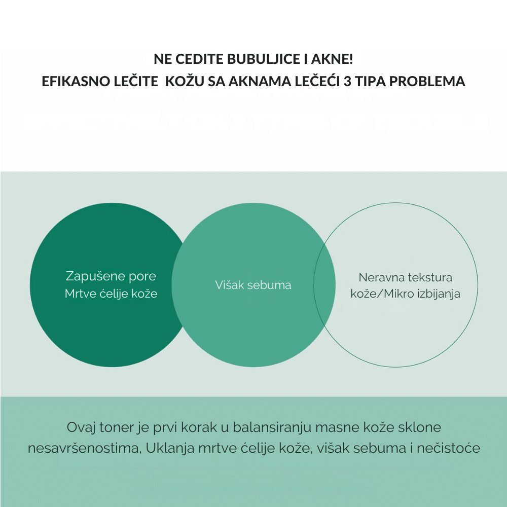 Osvežavajući tonik sa vodom lista čajevca i ekstraktom Centella Asiatica koji čisti pore, kontroliše sebum i umiruje kožu sklonu aknama.