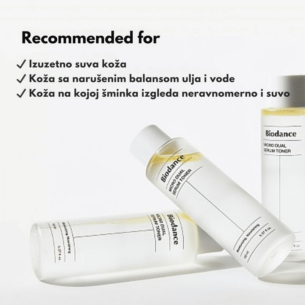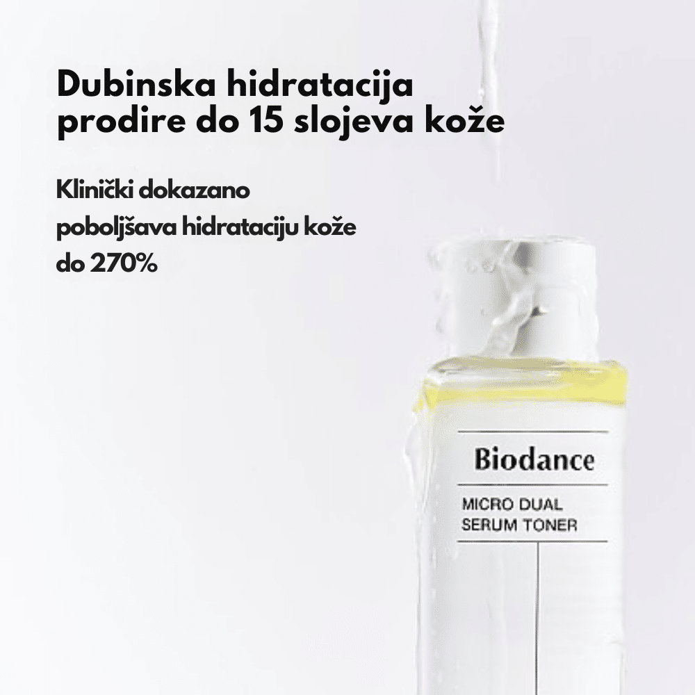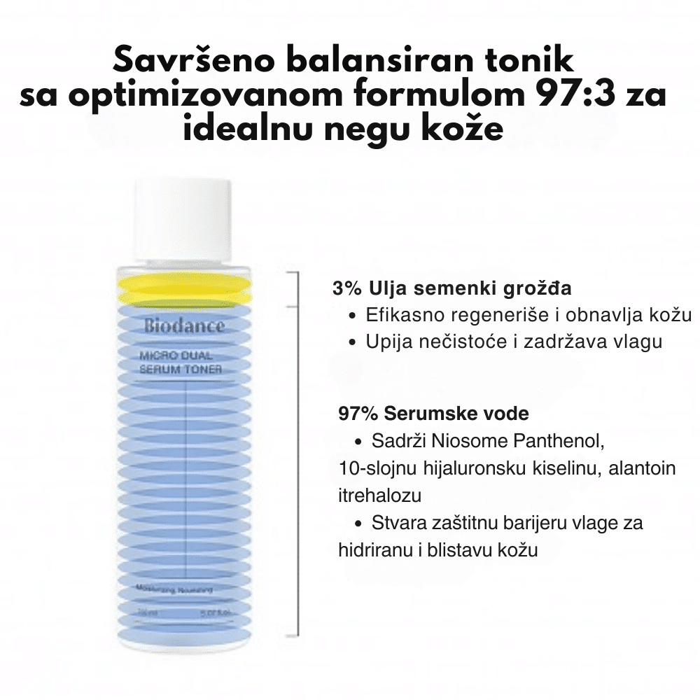 Zahvaljujući bogatoj hijaluronskoj kiselini u 10 slojeva, ovaj toner dubinski hidrira sve slojeve kože, dok ulje semenki grožđa hrani i štiti kožu od spoljašnjih uticaja. Sadrži Niosome Panthenol tehnologiju, koja omogućava dublju apsorpciju hidratantnih i regenerativnih sastojaka, ostavljajući kožu elastičnom i punom energije. Biodance Micro Dual Serum Toner koristi mikro dual tehnologiju, omogućavajući da se voda i uljna faza spoje kako bi koža dobila najbolju kombinaciju hidratacije i hranljivih sastojaka. Njegova laka i osvežavajuća tekstura brzo se upija bez ostavljanja lepljivog osećaja, savršena za sve tipove kože, uključujući osetljivu i suvu kožu.Ovaj toner je obogaćen uljem semenki grožđa, koje je bogato antioksidansima i esencijalnim masnim kiselinama, pomažući u jačanju kožne barijere i zaštiti od slobodnih radikala. Trehaloza i beta-glukan dodatno umiruju kožu, pružajući joj dugotrajnu zaštitu i hidrataciju.