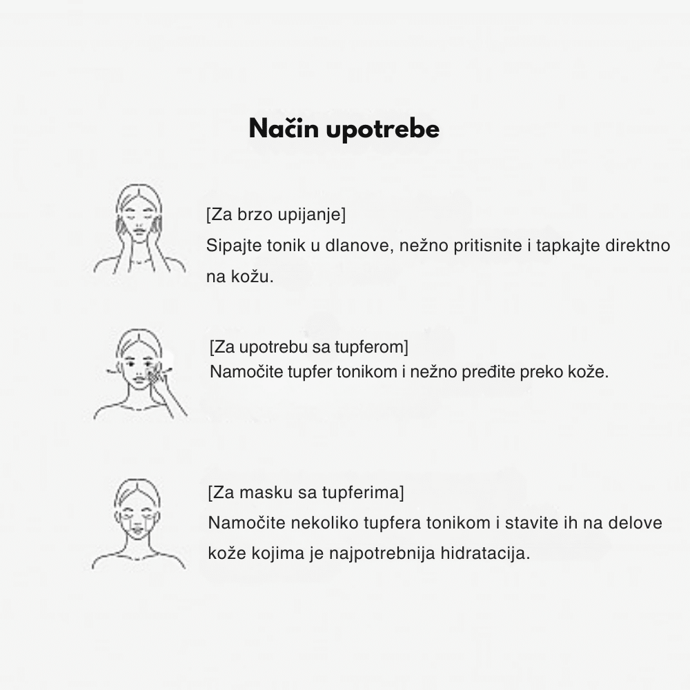 Nakon čišćenja lica, nanesite odgovarajuću količinu tonera na dlanove ili pamučni tupfer. Nežno ga rasporedite po licu i vratu, tapkajući dok se potpuno ne upije. Koristite ujutru i uveče kao deo vaše redovne rutine nege kože. Pre upotrebe, protresite bočicu kako biste pomešali dve faze proizvoda za optimalne rezultate.