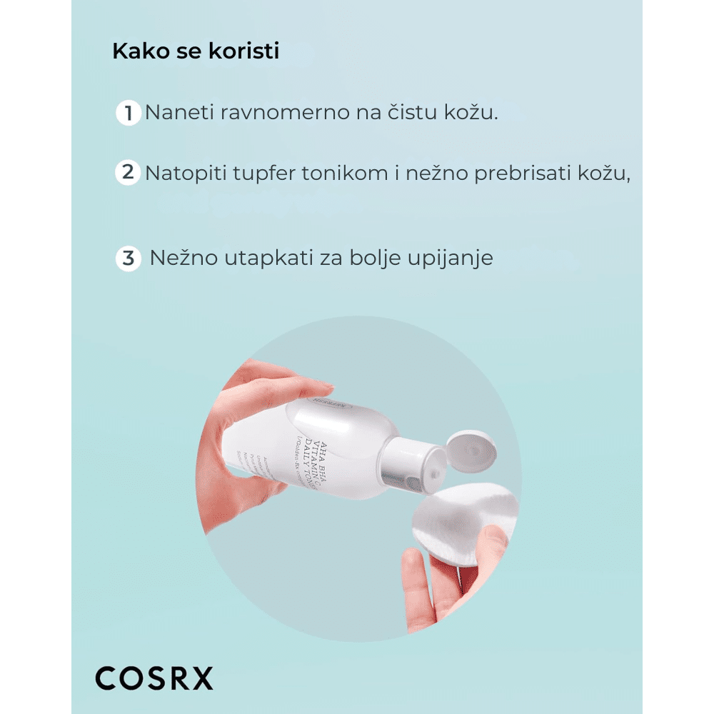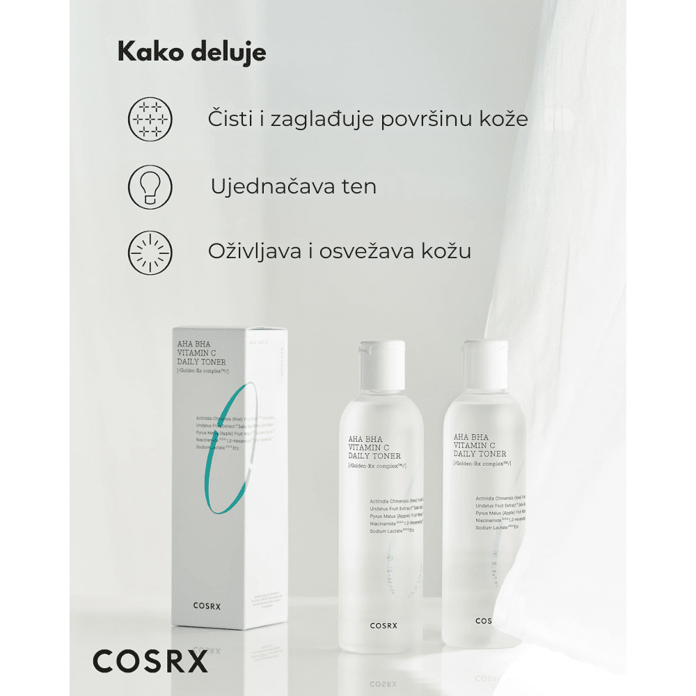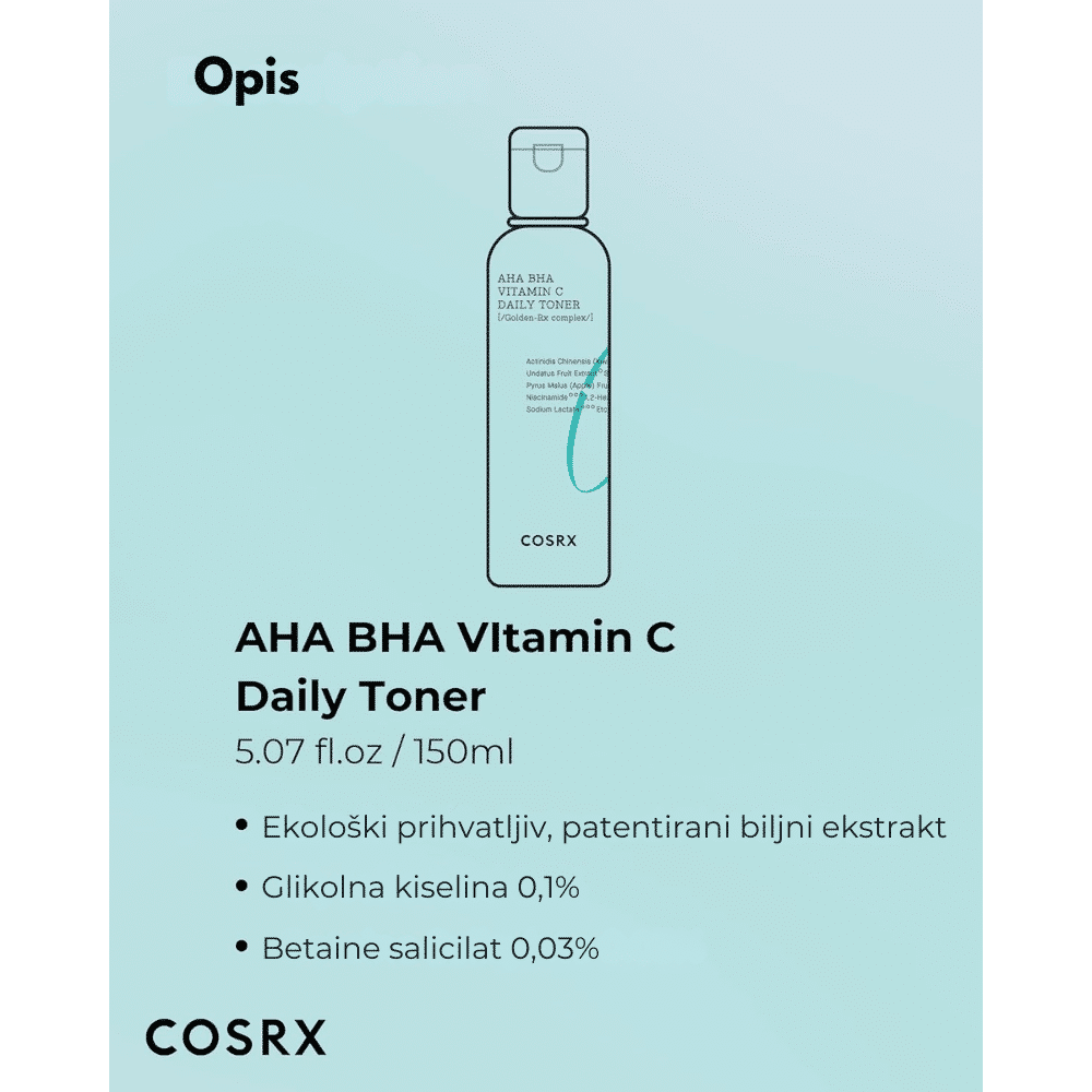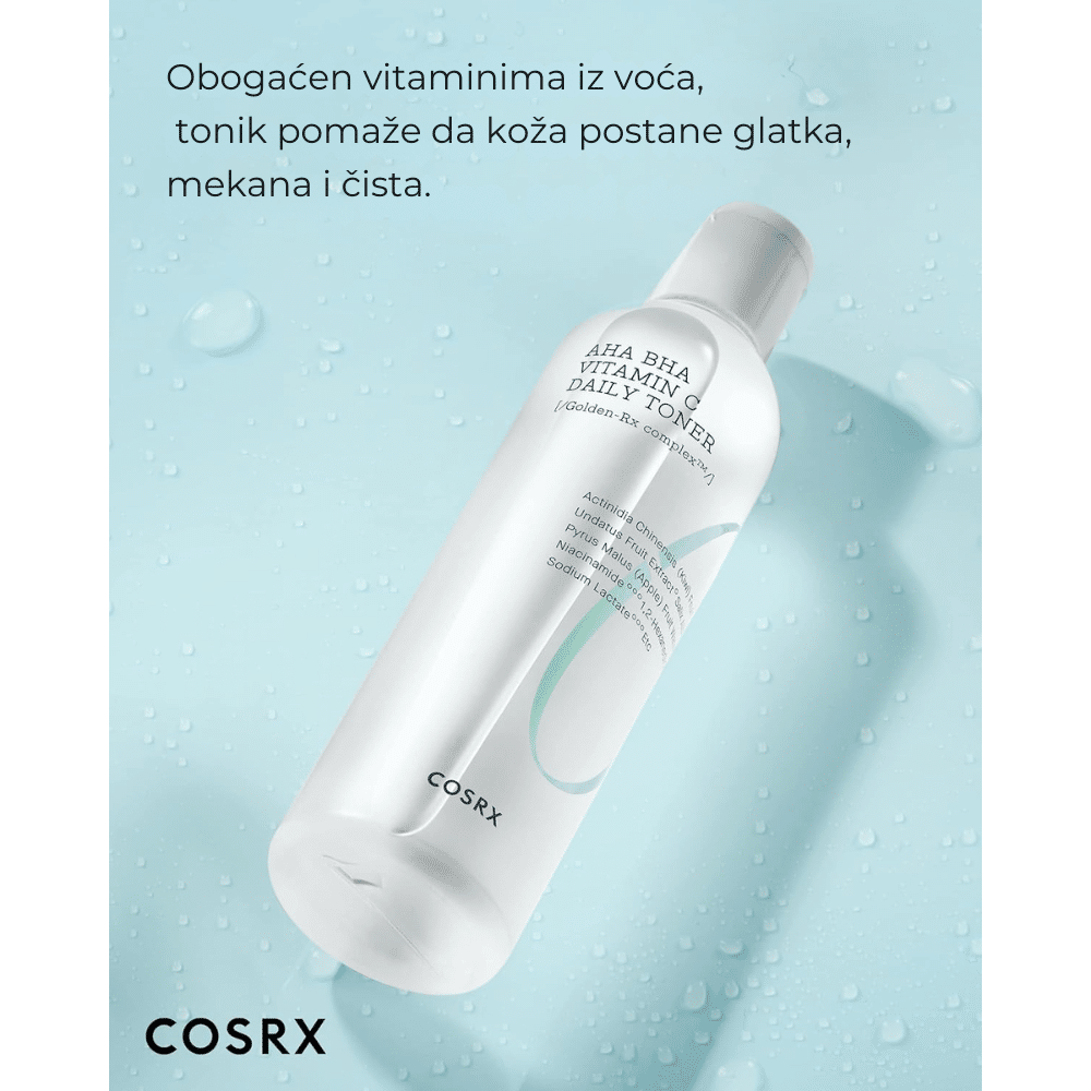 COSRX Refresh AHA BHA Vitamin C Daily Toner je revitalizujući tonik formulisan sa AHA, BHA kiselinama i vitaminom C, namenjen za blago eksfoliranje kože, poboljšanje njene teksture i posvetljivanje tena. Obogaćen patentiranim GOLDEN-RX COMPLEX™ koji kombinuje ekstrakte kivija (Actinidia Chinensis) i zmajevog voća (Hylocereus Undatus), ovaj tonik efikasno uklanja mrtve ćelije kože, smanjuje vidljivost pora i pruža osvežen izgled. Lagana, vodena tekstura omogućava brzo upijanje, ostavljajući kožu glatkom i pripremljenom za naredne korake nege. Pogodan je za sve tipove kože, uključujući osetljivu.