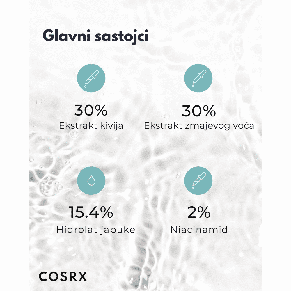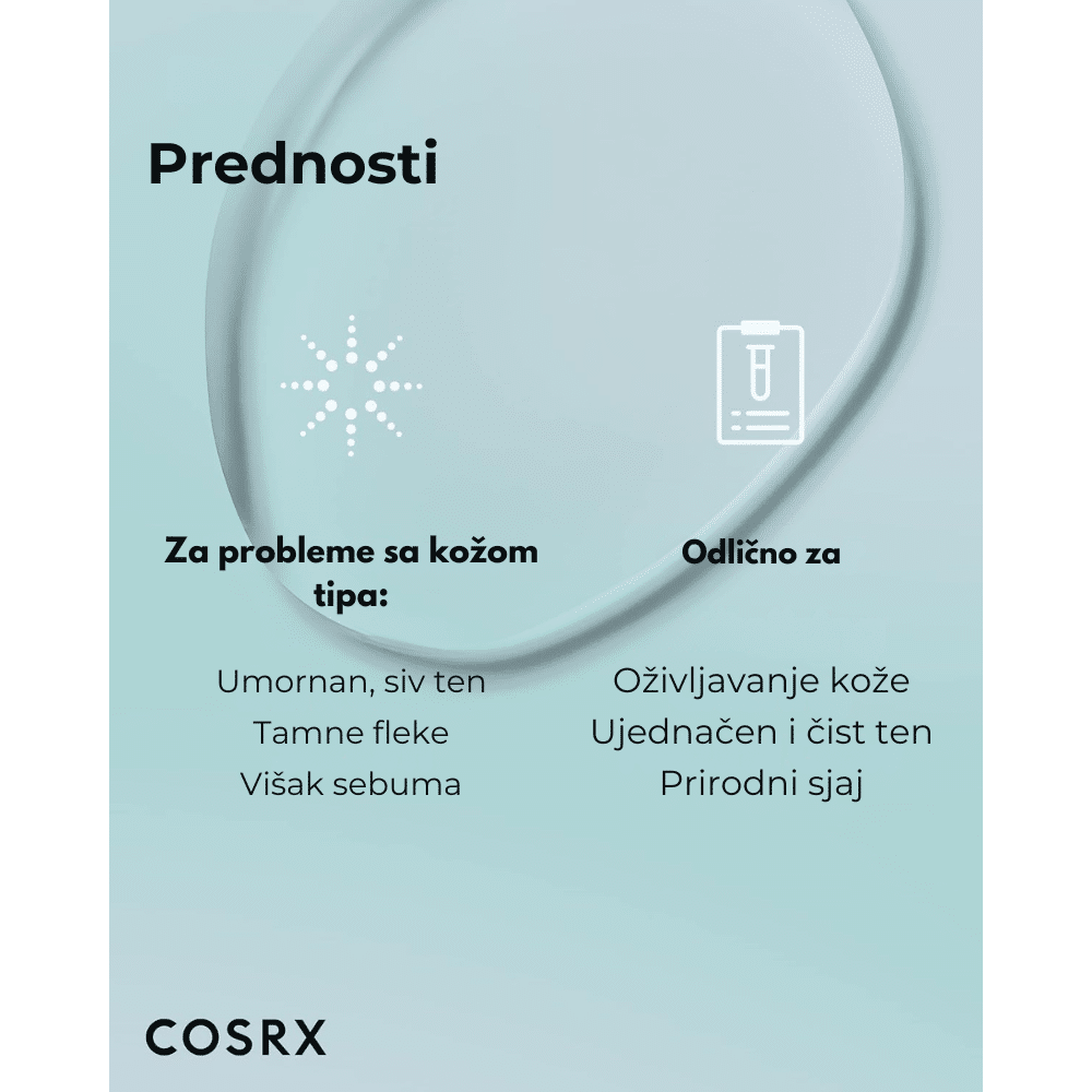 Cosrx je korejski kozmetički brend poznat po svojoj efikasnosti i jednostavnim, ali visokokvalitetnim proizvodima za negu kože. Osnovan 2013. godine, Cosrx je postao popularan zahvaljujući svojoj posvećenosti stvaranju proizvoda koji koriste minimalan broj sastojaka, ali sa maksimalnim učinkom, što ih čini idealnim za osetljivu kožu. Brend nudi širok spektar proizvoda, uključujući serume, tonere, maske i kreme, sa naglaskom na upotrebi sastojaka kao što su AHA, BHA, niacinamid, propolis i drugi biljni ekstrakti. Njihovi proizvodi su veganski, cruelty-free i ne sadrže parabene, sulfate ili veštačke mirise. Cosrx je prepoznat po svojoj jednostavnoj, ali efikasnoj formuli koja pomaže u rešavanju problema sa kožom kao što su akne, suvoća i nepravilnosti. Takođe, brend se ističe svojom posvećenostšću naučnoj i dermatološkoj istraživačkoj osnovi.
