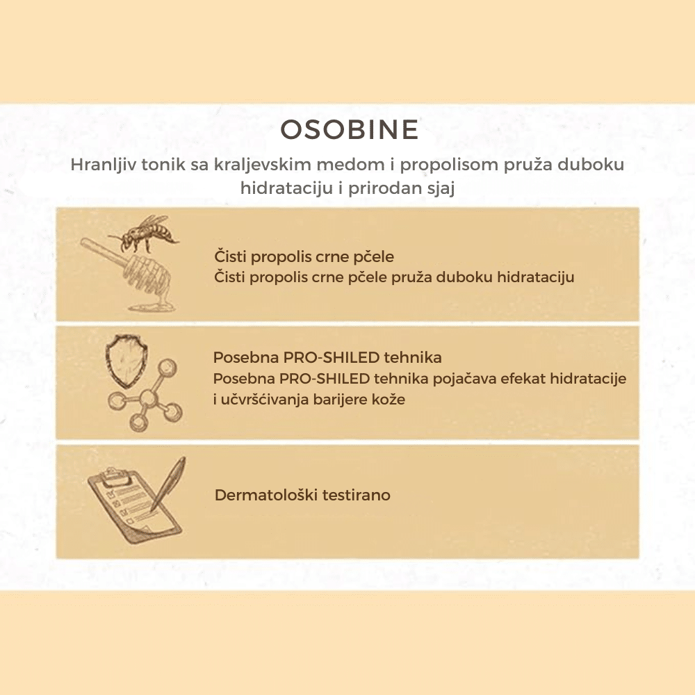 SKINFOOD Royal Honey Propolis Enrich Toner je luksuzni tonik bogat hranljivim i umirujućim sastojcima koji hidrira, jača i revitalizuje kožu. Formulisan sa 16% ekstrakta propolisa, 10% ekstrakta matičnog mleča, i 5% ekstrakta meda, ovaj tonik obnavlja kožnu barijeru, pruža intenzivnu hidrataciju i štiti kožu od spoljašnjih agresora. Njegova bogata, ali brzo upijajuća tekstura savršeno priprema kožu za dalju negu, ostavljajući je glatkom, mekom i blistavom.