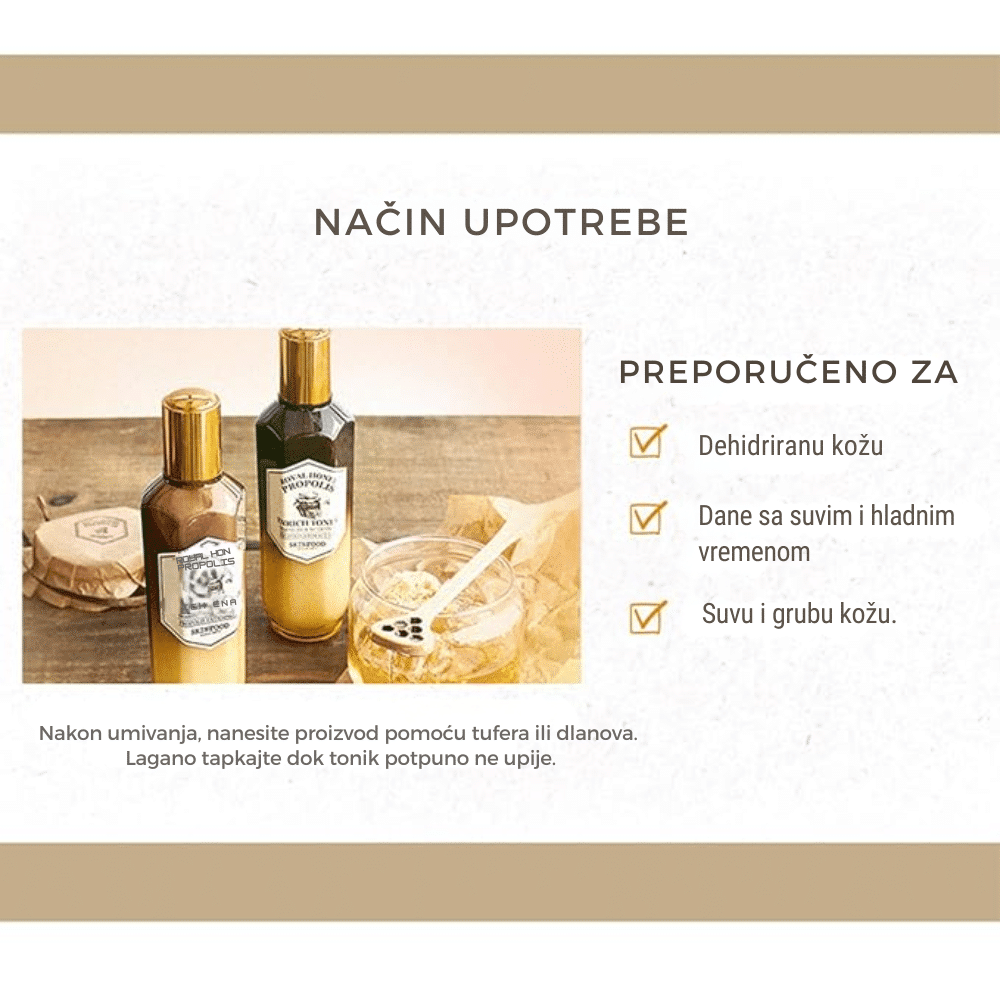 SKINFOOD Royal Honey Propolis Enrich Toner hidrira, jača kožnu barijeru i revitalizuje kožu uz propolis, matično mleko i med.