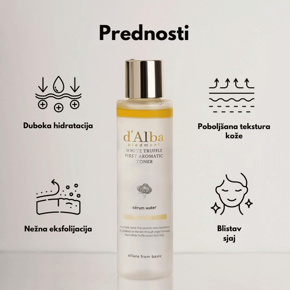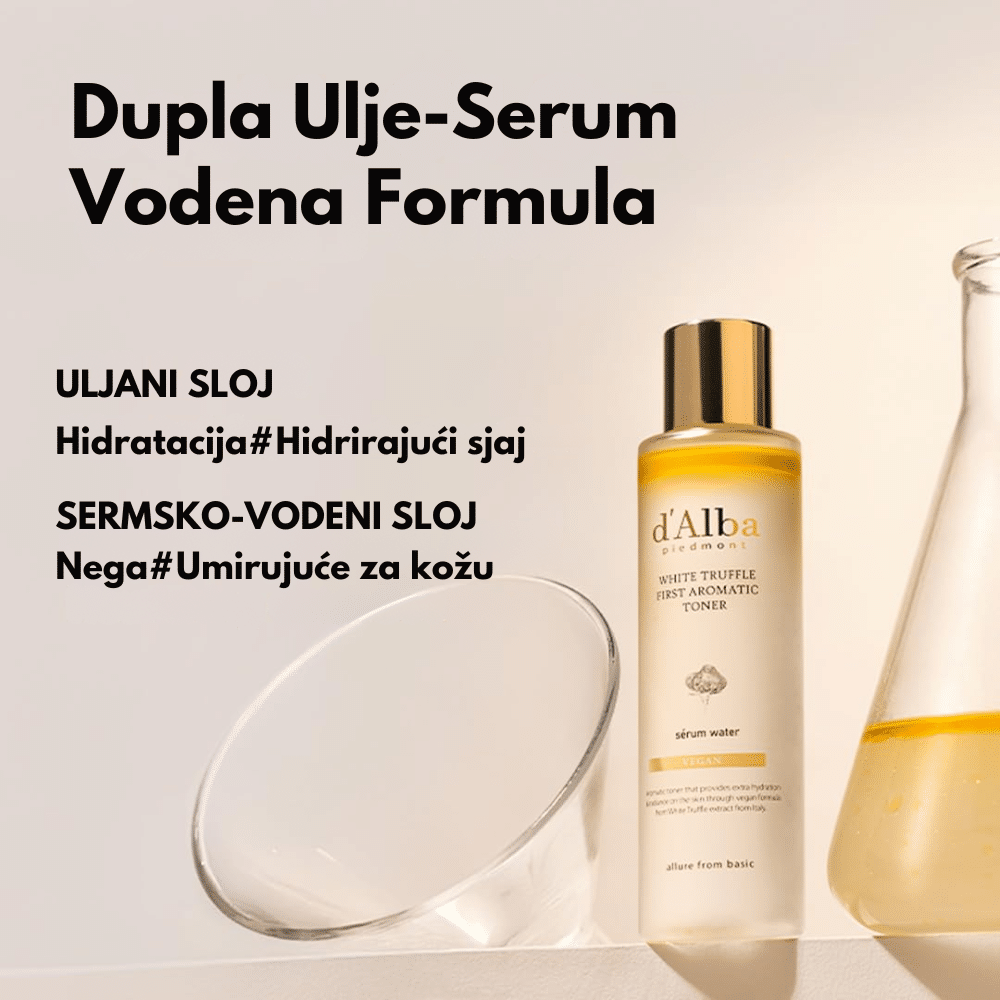 d’Alba White Truffle First Aromatic Toner je luksuzni veganski tonik dizajniran da obezbedi intenzivnu hidrataciju i revitalizaciju kože. Obogaćen ekstraktom belog tartufa iz Pijemonta, Italija, i vitaminom E (Trufferol™ kompleks), ovaj tonik pruža snažnu antioksidativnu zaštitu, pomažući u borbi protiv slobodnih radikala i starenja kože. Njegova dvofazna formula kombinuje vodeni serum i uljani sloj koji zajedno pružaju optimalnu hidrataciju i zadržavanje vlage, ostavljajući kožu glatkom i osveženom bez osećaja težine ili lepljivosti. Prisustvo ružine vodice (Rosa Damascena Flower Water) umiruje kožu i pruža prijatan cvetni miris, dok ekstrakt zelenog čaja (Camellia Sinensis Leaf Extract) sužava pore i poboljšava teksturu kože. Tonik je slabokiselinski sa pH vrednošću između 4,0 i 6,0, što odgovara prirodnom stanju kože, pomažući u održavanju njene ravnoteže i zaštite od bakterija. Sadrži nežne eksfolijante poput fitoenzimskog kompleksa i PHA (gluconolactone), koji uklanjaju mrtve ćelije kože i pospešuju obnavljanje ćelija, čineći ten blistavijim i ujednačenijim.