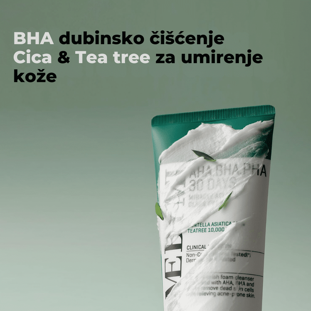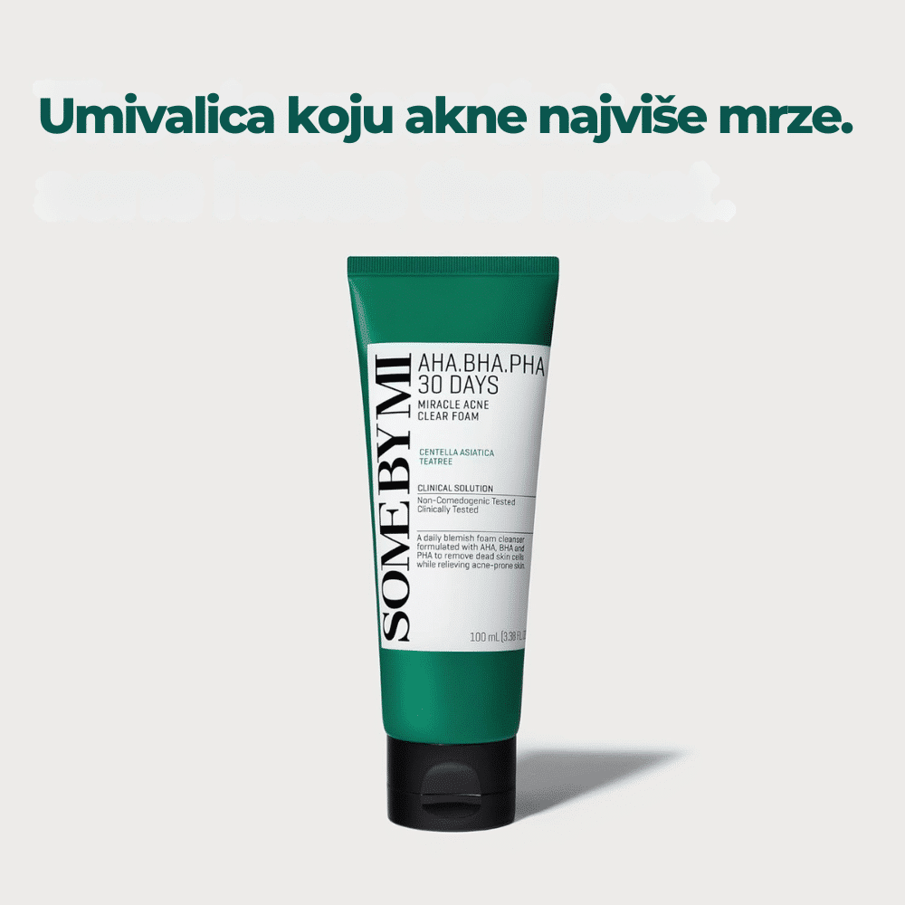 SOMEBYMI AHA.BHA.PHA 30 Days Miracle Foam 100ml je nežna pena za čišćenje lica koja dubinski uklanja nečistoće, sebum i mrtve ćelije kože, dok istovremeno balansira pH vrednost i umiruje kožu. Formulisana sa AHA, BHA i PHA kiselinama, ova pena pruža blagu eksfolijaciju, čisti pore i smanjuje pojavu akni i mitisera. Obogaćena ekstraktom čajevca i hijaluronskom kiselinom, umiruje iritacije i hidrira kožu, ostavljajući je osveženom i glatkom. Idealna je za sve tipove kože, uključujući masnu i osetljivu, kao prvi korak u rutini nege.
