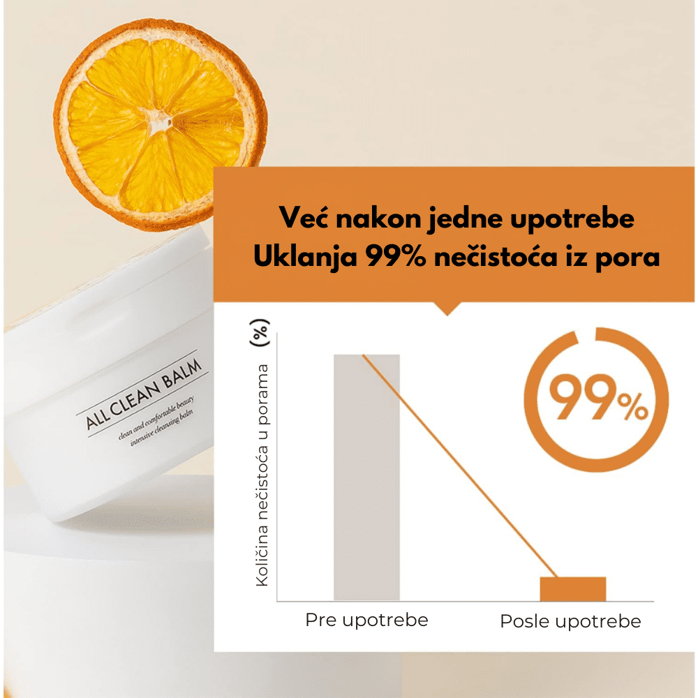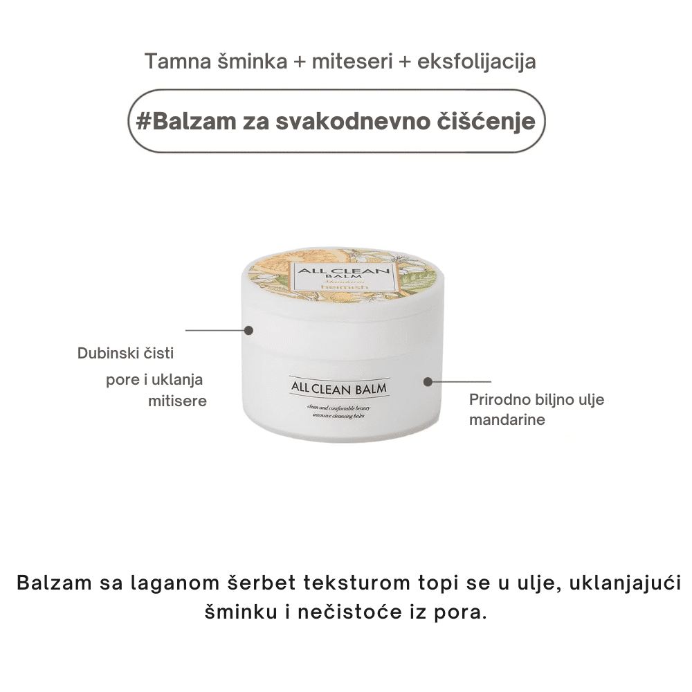 Heimish All Clean Balm Mandarin 120ml je balm za čišćenje koji efikasno uklanja šminku, nečistoće i višak sebuma, dok pruža dubinsku hidrataciju i osveženje. Obogaćen ekstraktom madarine, ovaj proizvod osvežava kožu i pruža prirodnu energiju, čineći je zdravijom i blistavijom. Heimish All Clean Balm Mandarin koristi balm-to-oil tehnologiju, koja se pri kontaktu sa kožom pretvara u ulje, efikasno uklanjajući šminku i prljavštinu bez isušivanja kože. Shea butter i hijaluronska kiselina dodatno hrane kožu, obnavljaju njen vlažni balans i čine je glatkom i mekom. Ovaj proizvod je savršen za sve tipove kože, uključujući osetljivu kožu, jer efikasno čisti, dok koži pruža svežinu, hidrataciju i regeneraciju. Maska je savršen izbor za prvi korak u rutini čišćenja, posebno za kožu sa izraženim porama, umornu ili suvu kožu.