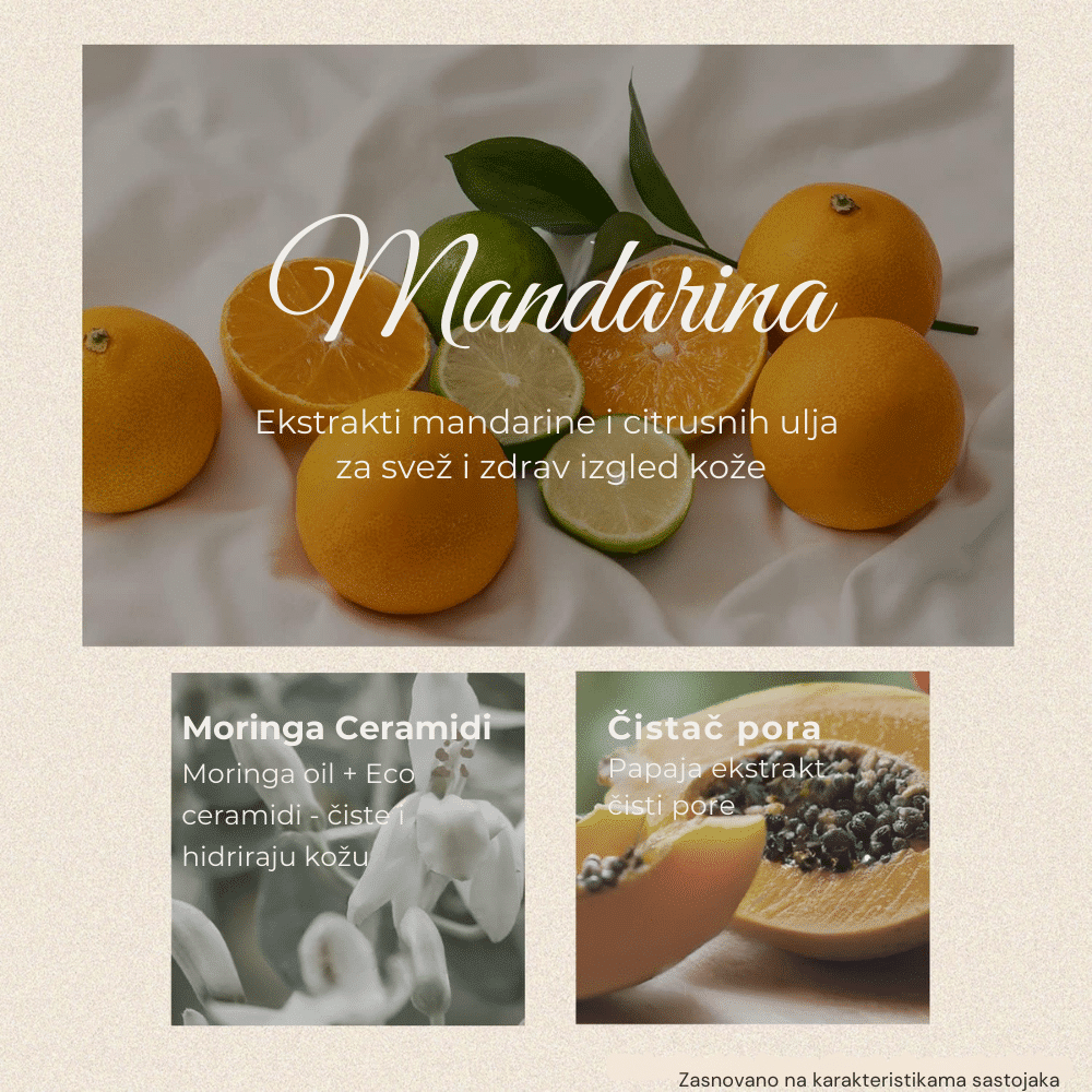 Mandarina - Bogata vitaminom C, antioksidansima i esencijalnim hranljivim sastojcima, mandarina pomaže u posvetljivanju tena, ujednačavanju kože i smanjenju znakova umora. Podstiče proizvodnju kolagena, poboljšava hidrataciju i elastičnost, dok istovremeno pruža zaštitu od slobodnih radikala. Ostavlja kožu osveženom, sjajnom i revitalizovanom.