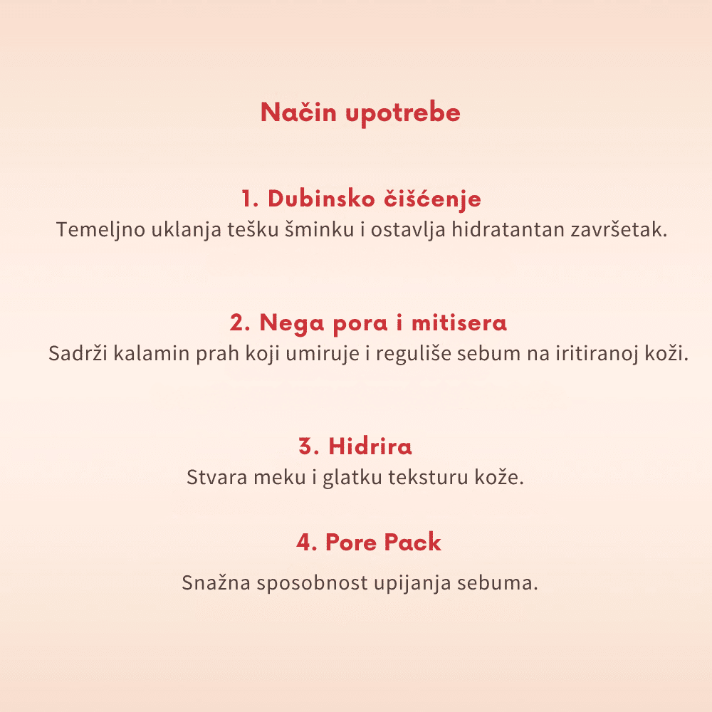 Nanesite odgovarajuću količinu TOCOBO Calamine Pore Control Cleansing Oil na suvo lice i umasirajte nežnim kružnim pokretima, fokusirajući se na područja sa začepljenim porama i viškom sebuma. Dodajte malo vode da biste emulgovali ulje, a zatim nastavite s masažom dok se ulje ne pretvori u mlečnu emulziju. Temeljno isperite mlakom vodom i nastavite sa penom za čišćenje za kompletno čišćenje. Izbegavajte kontakt sa očima. U slučaju iritacije, prekinite upotrebu.