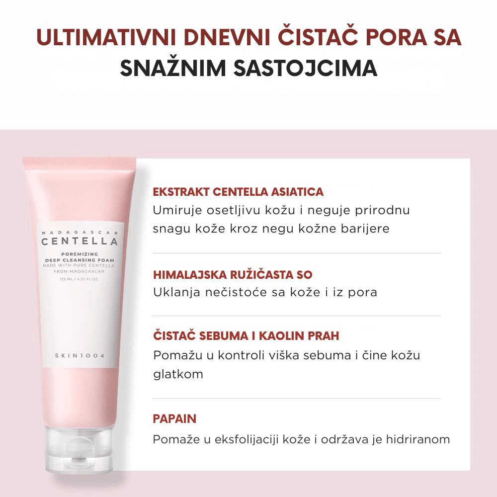 SKIN1004 Madagascar Centella Poremizing Deep Cleansing Foam je bogata, kremasta pena za čišćenje lica koja dubinski uklanja nečistoće, višak sebuma i ostatke šminke, ostavljajući kožu čistom i osveženom. Formulisana sa 20,97% ekstrakta Centella Asiatica iz netaknute prirode Madagaskara, poznatog po umirujućim i regenerativnim svojstvima, ova pena pomaže u smirivanju iritacija i održavanju zdrave barijere kože. Obogaćena mineralnim solima, kaolinom i papainom, deluje kao magnet za upijanje nečistoća i viška sebuma, pružajući blagu eksfolijaciju i sužavanje pora.