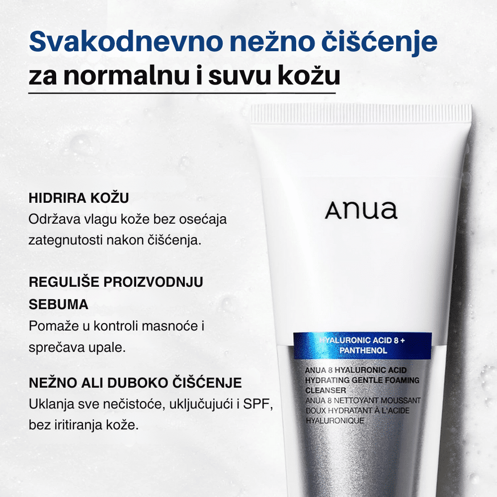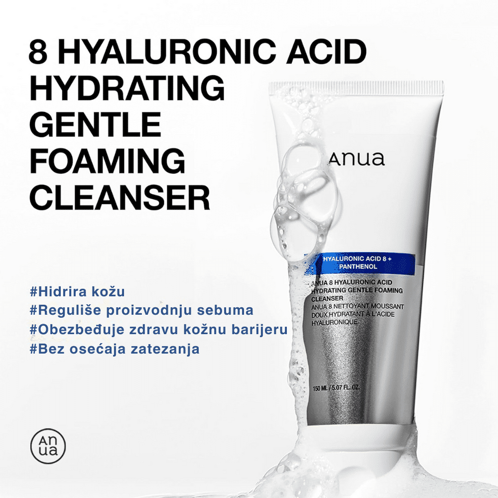 ANUA 8 Hyaluronic Acid Hydrating Gentle Foaming Cleanser 150ml je nežni gel za čišćenje sa 8 vrsta Hijaluronske kiseline koje dubinski hidratiraju kožu, ostavljajući je mekom i glatkom. Ovaj penasta umivalica efikasno uklanja nečistoće, višak sebuma i ostatke šminke, dok istovremeno obnavlja vlažnost kože.