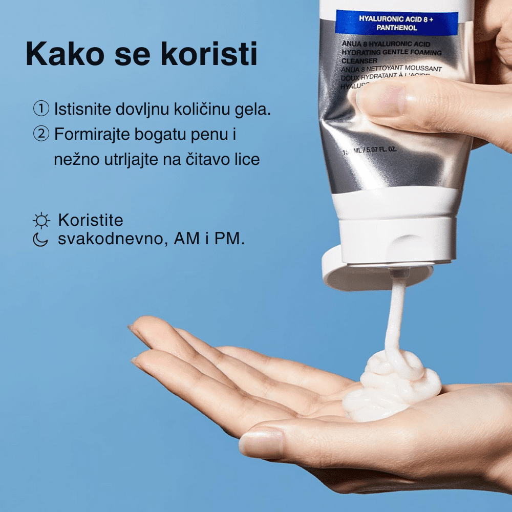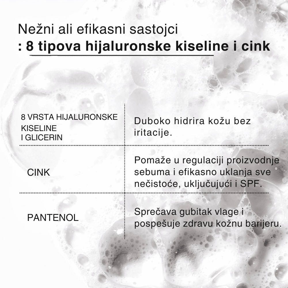 Nežni gel za čišćenje sa 8 vrsta hijaluronske kiseline koji dubinski hidratira kožu, uklanja nečistoće i održava prirodnu ravnotežu kože.