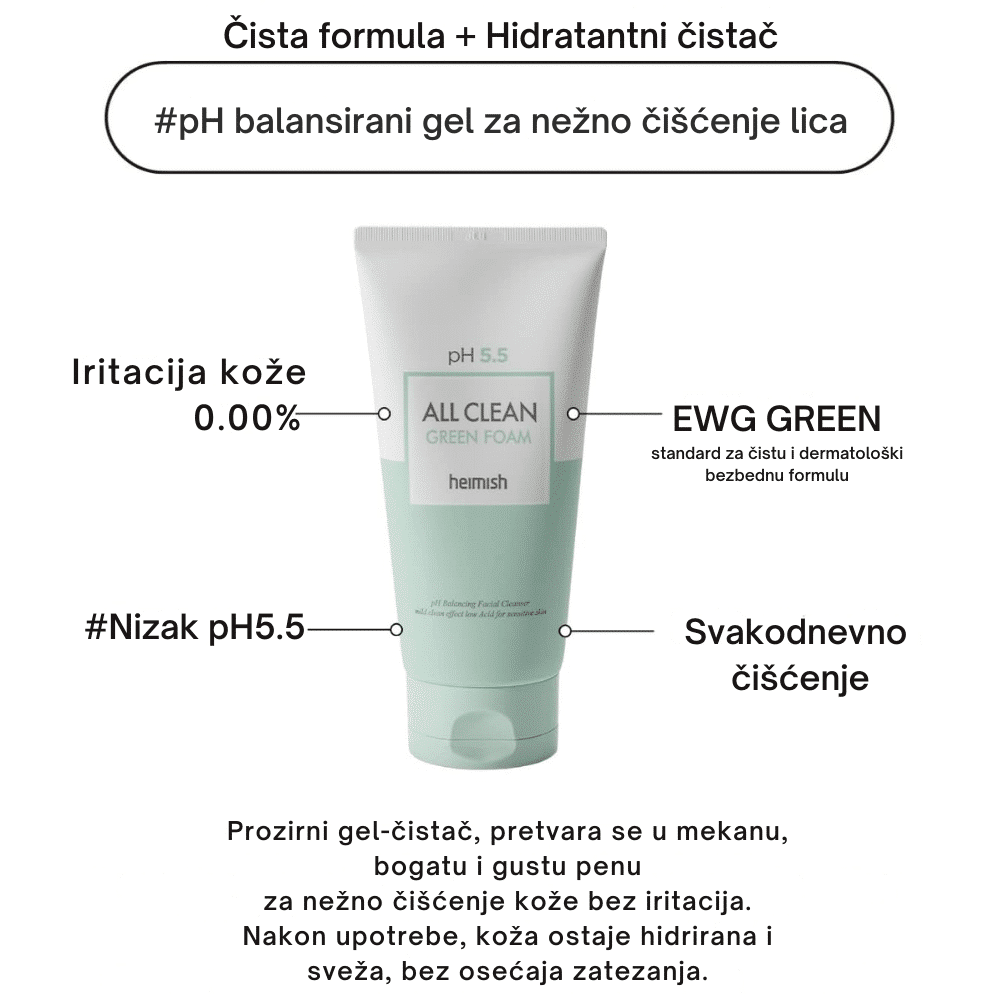 Heimish All Clean Green Foam 150g je blagi, ali efikasni gel za čišćenje koji je formulisan sa ekstraktom Hamamelis biljke i ekstraktom Centelle Asiatice koji pružaju antiinflamatorne, antibakterijske i umirujuće efekte. Ovaj gel se pri upotrebi pretvara u bogatu penu, omogućavajući temeljno, ali nežno čišćenje, idealno za osetljivu kožu. Hijaluronska kiselina dubinski hidrira, pomažući da koža ostane glatka i meka. Heimish All Clean Green Foam je idealan za kožu koja je sklona iritacijama, suvoći ili osetljivosti, jer efikasno uklanja prljavštinu, šminku i višak sebuma, a istovremeno ne isušuje kožu. Ovaj proizvod pruža dubinsko čišćenje i osveženje, ostavljajući kožu čistom, hidriranom i zdravog izgleda.