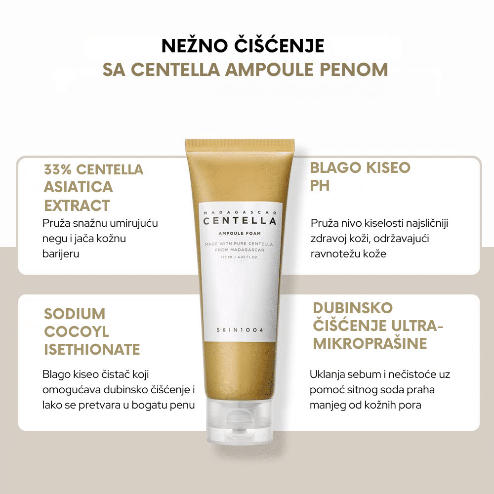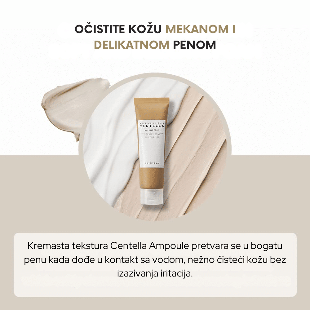 SKIN1004 Madagascar Centella Ampoule Foam je blaga, ali izuzetno efikasna pena za čišćenje lica koja pruža temeljno uklanjanje nečistoća, šminke i viška sebuma, dok istovremeno čuva prirodnu barijeru kože. Ova pena sadrži ekstrakt Centella Asiatica iz Madagaskara, poznat po svojim umirujućim i regenerativnim svojstvima, što je čini savršenom za osetljivu i iritiranu kožu.