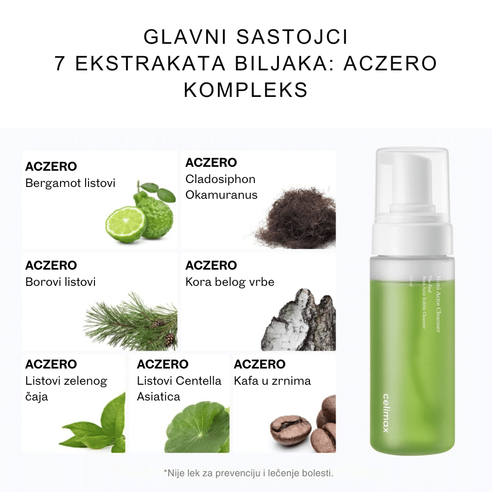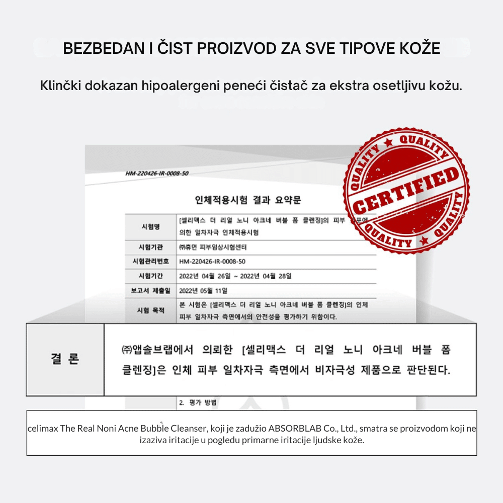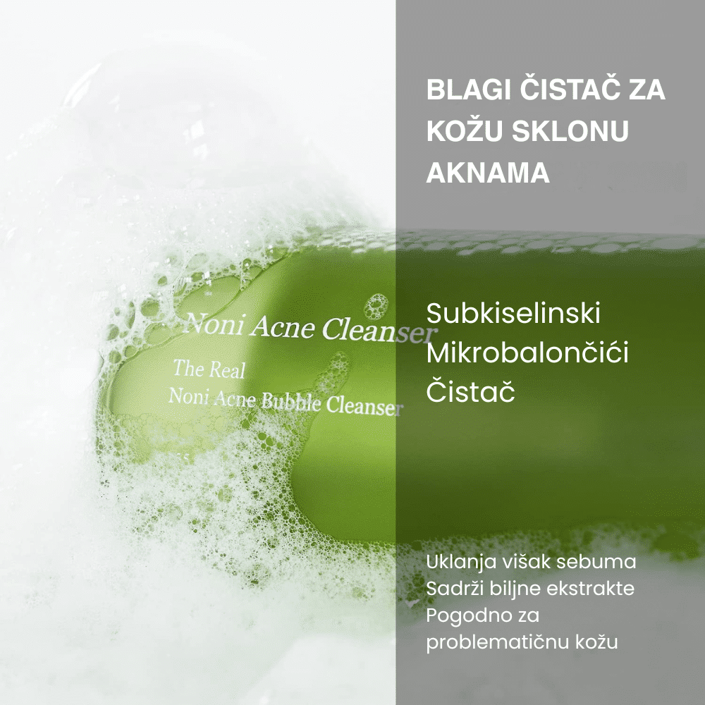 Celimax The Real Noni Acne Bubble Cleanser je nežni pH-balansirani penasti čistač koji efikasno uklanja nečistoće, višak sebuma i šminku, dok istovremeno hidrira i umiruje kožu. Obogaćen ekstraktom noni voća (Morinda Citrifolia), bogatim vitaminima i mineralima, ovaj čistač pruža preko 200 esencijalnih hranljivih sastojaka koji podržavaju zaštitnu barijeru kože. BHA (salicilna kiselina) nežno eksfolira mrtve ćelije kože, pomažući u čišćenju pora i prevenciji akni. ACZERO kompleks dodatno umiruje kožu sklonu aknama, smanjujući crvenilo i iritacije. Hipoalergena formula bez agresivnih hemikalija čini ovaj proizvod pogodnim za sve tipove kože, uključujući osetljivu i kožu sklonu aknama.