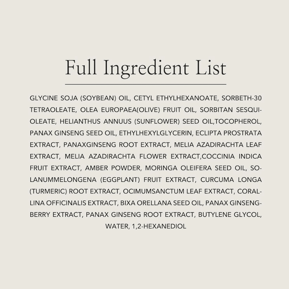Glycine Soja (Soybean) Oil, Cetyl Ethylhexanoate, Sorbeth-30 Tetraoleate, Olea Europaea (Olive) Fruit Oil, Sorbitan Sesquioleate, Helianthus Annuus (Sunflower) Seed Oil, Tocopherol (Vitamin E), Panax Ginseng Seed Oil, Ethylhexylglycerin, Eclipta Prostrata Extract, Panax Ginseng Root Extract, Melia Azadirachta Leaf Extract, Melia Azadirachta Flower Extract, Coccinia Indica Fruit Extract, Amethyst Powder, Moringa Oleifera Seed Oil, Solanum Melongena (Eggplant) Fruit Extract, Curcuma Longa (Turmeric) Root Extract, Ocimum Sanctum Leaf Extract, Corallina Officinalis Extract, Bixa Orellana Seed Oil, Panax Ginseng Berry Extract, Panax Ginseng Root Extract, Butylene Glycol, Water, 1,2-Hexanediol