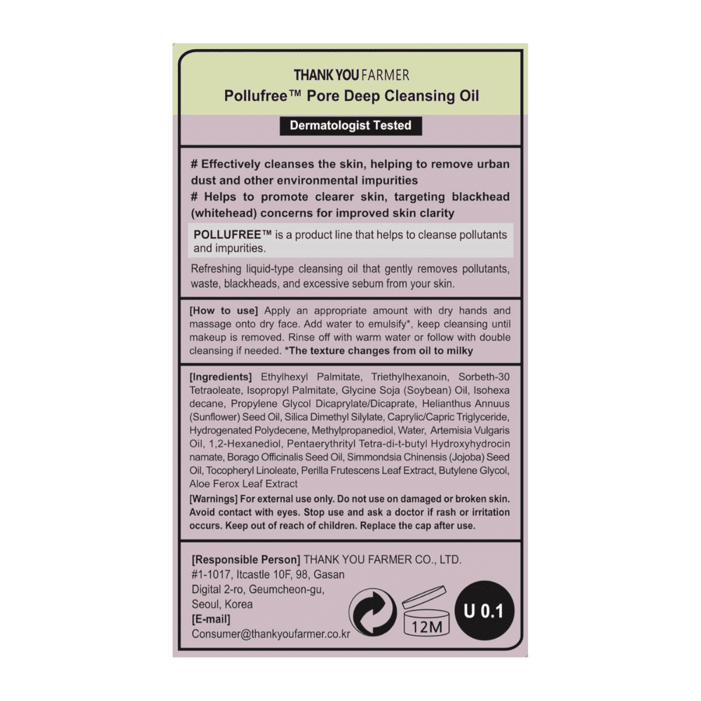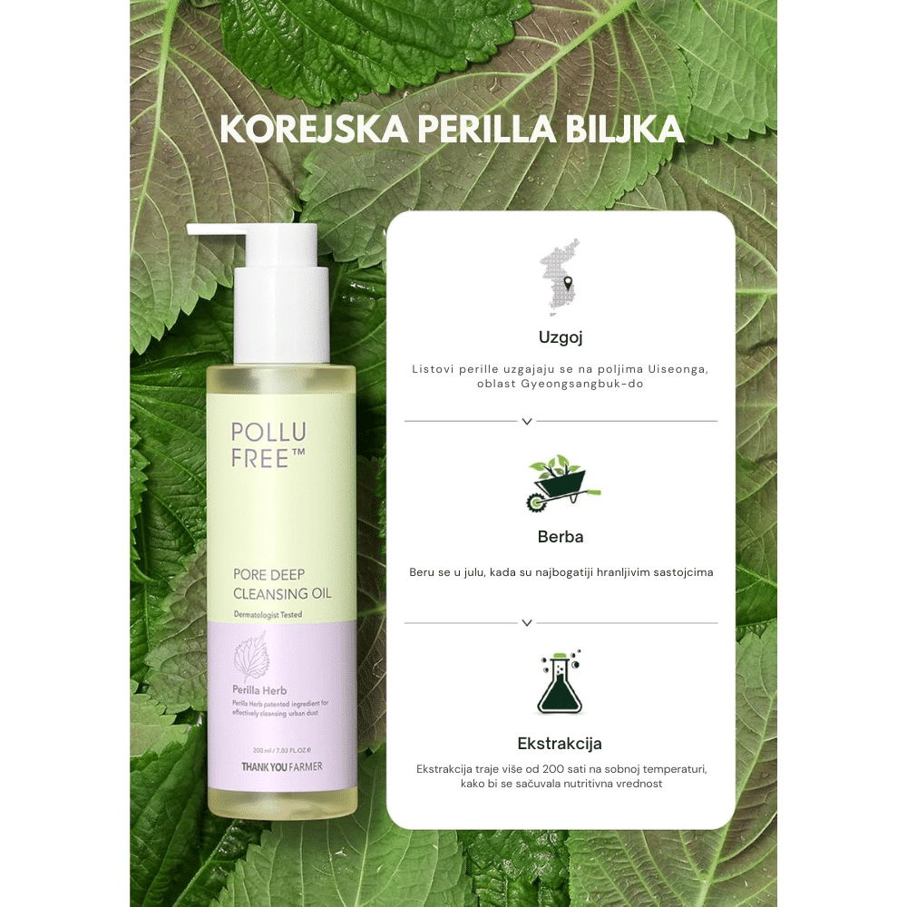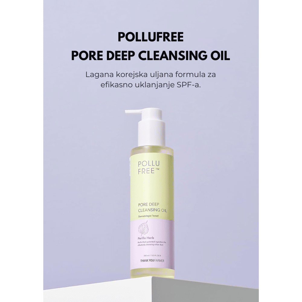 THANK YOU FARMER Pollufree™ Pore Deep Cleansing Oil 200ml je osvežavajuće ulje za čišćenje koje efikasno uklanja nečistoće, višak sebuma, crne tačke i šminku, uključujući i vodootpornu, bez iritacije kože. Formulisano je sa 10.000 ppm ekstrakta perila biljke, poznate po svojim antioksidativnim i umirujućim svojstvima, koja pomaže u zaštiti kože od zagađenja i finih čestica prašine . Dodatni biljni sastojci poput ulja soje, suncokreta, jojobe i boražine pružaju hidrataciju i obnavljaju kožnu barijeru, ostavljajući kožu mekom i osveženom nakon upotrebe