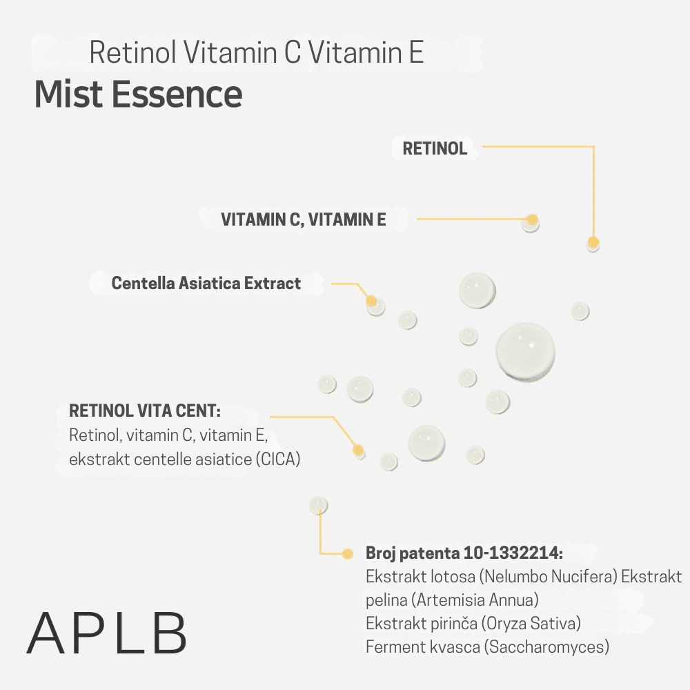 APLB Retinol Vitamin C Vitamin E Mist Essence je višenamenska esencija u spreju koja kombinuje moćne sastojke za revitalizaciju i osveženje kože. Formulisana sa RETINOL VITA CEN™ kompleksom, koji sadrži retinol, vitamin C i vitamin E, ova esencija pomaže u minimiziranju proširenih pora, poboljšava teksturu kože i vraća joj prirodni sjaj. Ekstrakt Centella Asiatica (19,4%) zajedno sa panthenolom i alantoinom umiruje iritacije i pruža intenzivnu hidrataciju, čineći kožu mekom i osveženom. Lagana formula se brzo upija bez ostavljanja lepljivog osećaja, pogodna za sve tipove kože, uključujući osetljivu.